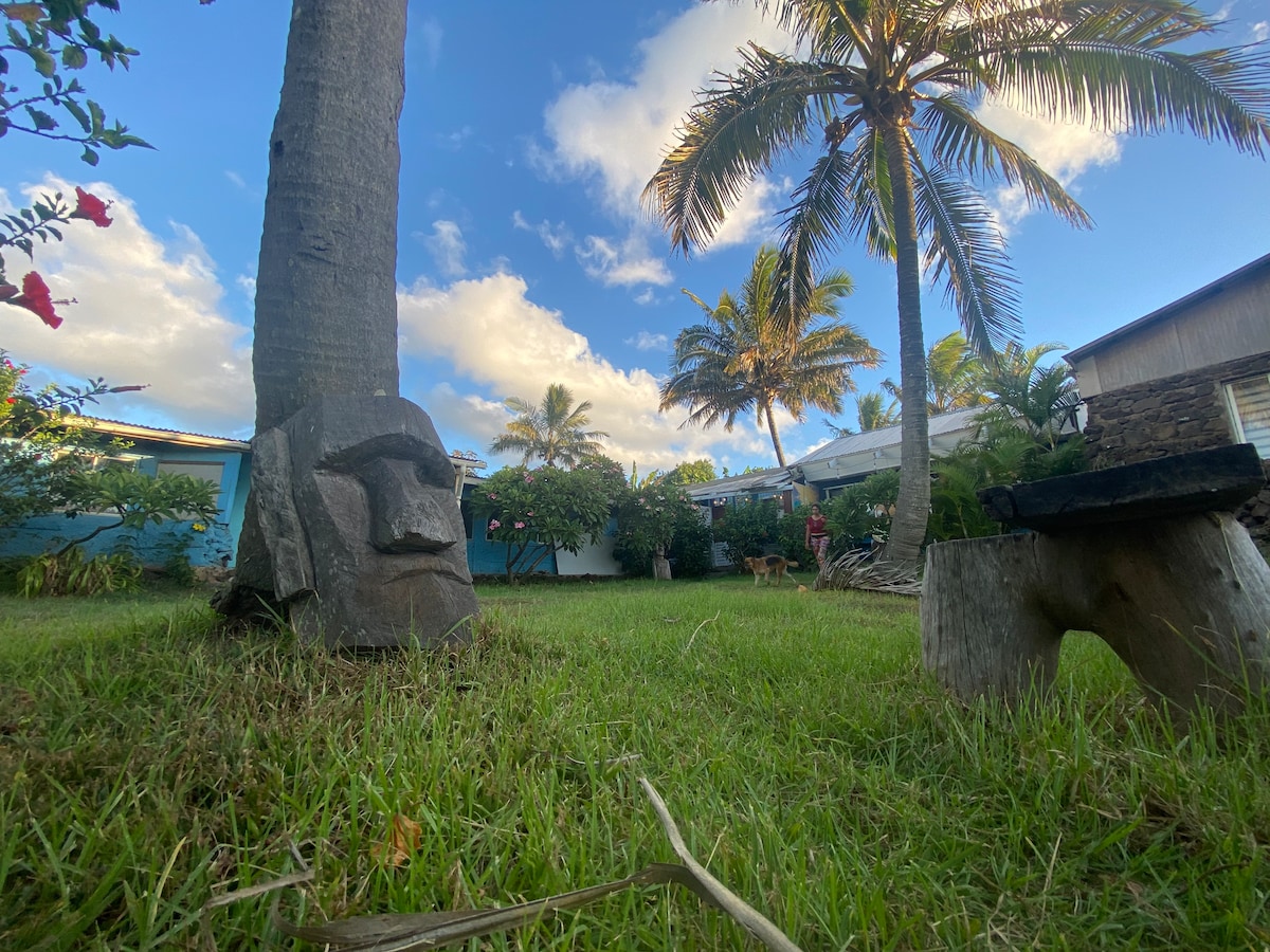 Loin des nuits bruyantes du village, louez votre maison dans un grand jardin calme, fleuri, aux vestiges archéologiques. Les cottages sont décorés de troncs sculptés, peintures et créations d'artistes locaux. Engagés pour un tourisme éco-responsable, Céline, écrivaine, conteuse française et Juan, agriculteur bio rapanui vous accueillent pour personnaliser votre séjour et le rendre unique. Location de voiture à prix préférentiel, tours, conseils. Idéal pour les enfants, le yoga et déconnecter.