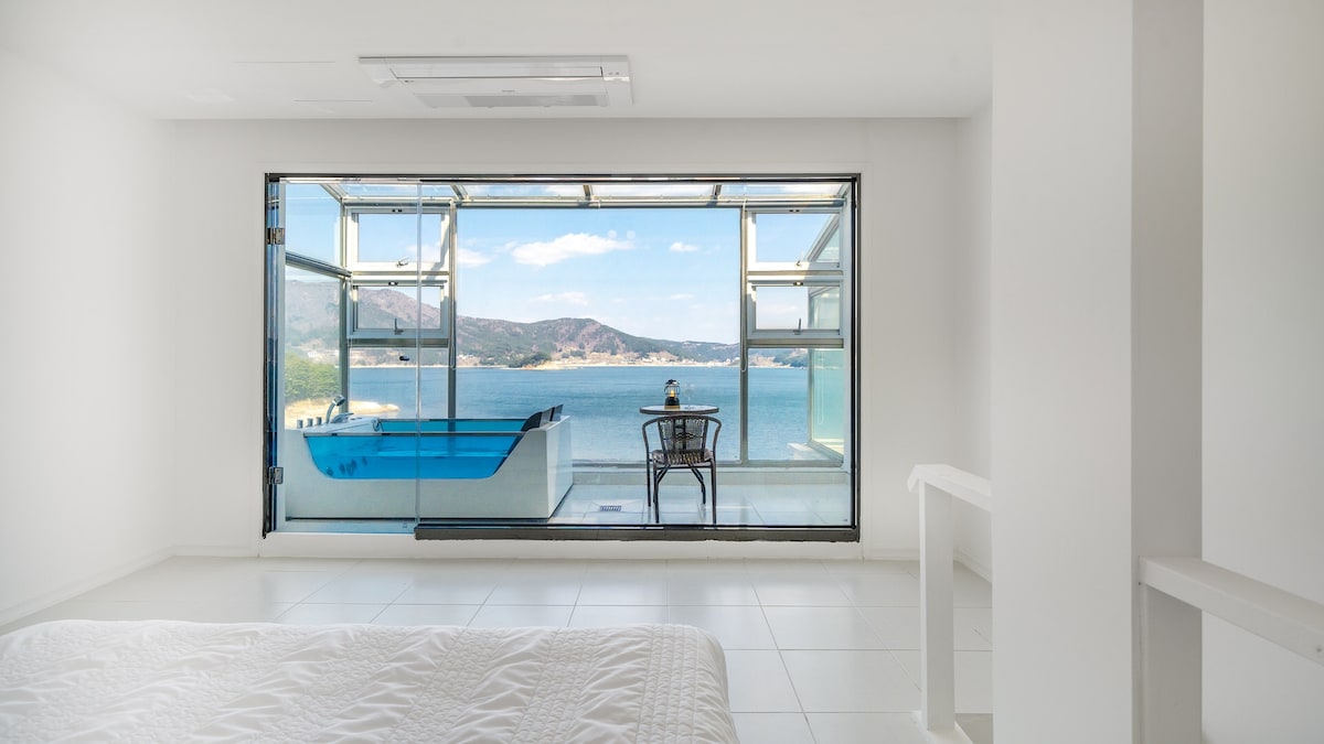Kamar 104 dengan kolam renang air hangat dan spa, tempat Anda dapat bersantai sambil melihat laut biru Geoje