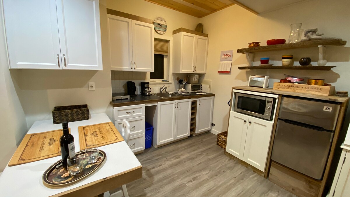 Welcome to our quiet guest suite. Second level suite, custom built with local decor throughout, including local beach wood. One minute walk to the beach and plenty of good hiking in the area. One queen bed, small kitchenette, full bathroom. Free parking for one vehicle. Private entrance, self contained suite. Mountain and peak-a-boo ocean views. EV charging available upon request (standard plugin). BC Registration Number: PM060144316