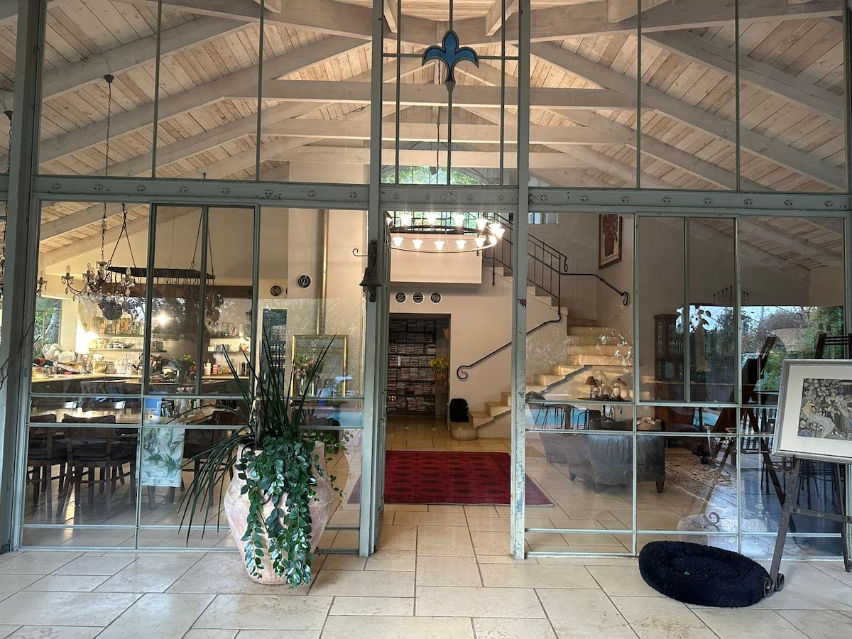 Menginap di rumah 3 kamar tidur mewah saya di desa yang tenang di Israel tengah, menampilkan langit - langit setinggi 6 meter dan perpaduan unik antara seni pop kelas atas dan dekorasi vintage. Nikmati pemandangan matahari terbit dari kamar tidur utama dan matahari terbenam dari teras panorama dengan jacuzzi dan pancuran luar ruangan. Termasuk dapur lengkap, kamar anak - anak dengan tempat tidur susun, kamar aman (mamad) dengan area kerja dan bermain, Wi - Fi cepat, Netflix, mesin cuci, dan pengering. Sangat cocok untuk mereka yang mencari kenyamanan dan gaya!