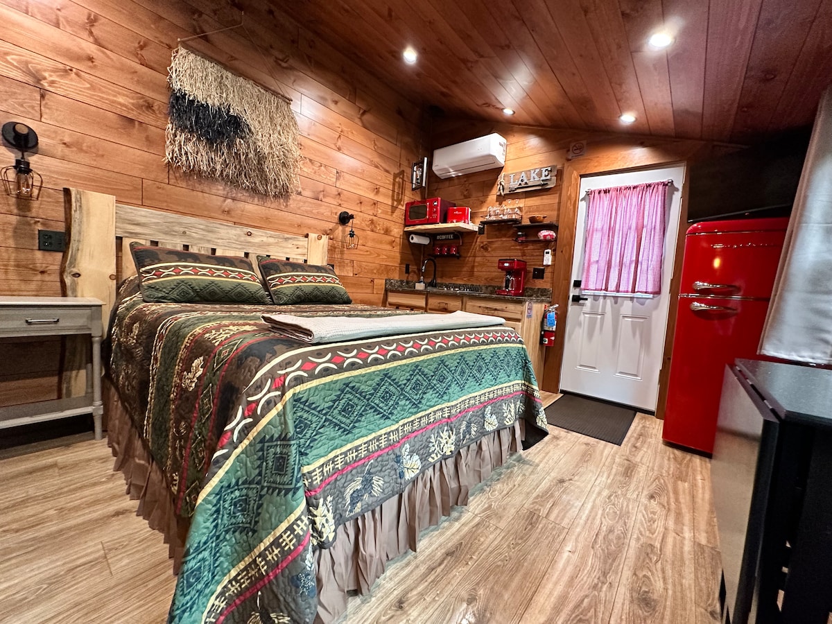 "The Pond" is a part of The Lakes, a luxury cottage colony in Old Forge, NY. It is our version of a tiny home. It is adjacent to an existing cabin but at the same time it is its own entity with a private entrance and an outdoor sitting area and shared waterfront spaces. It is furnished with a queen size bed, small kitchen with full fridge, two-burner stove and full bathroom with shower. There is a small reading corner with an armchair and an ottoman. Perfect for a solo traveler or a couple!