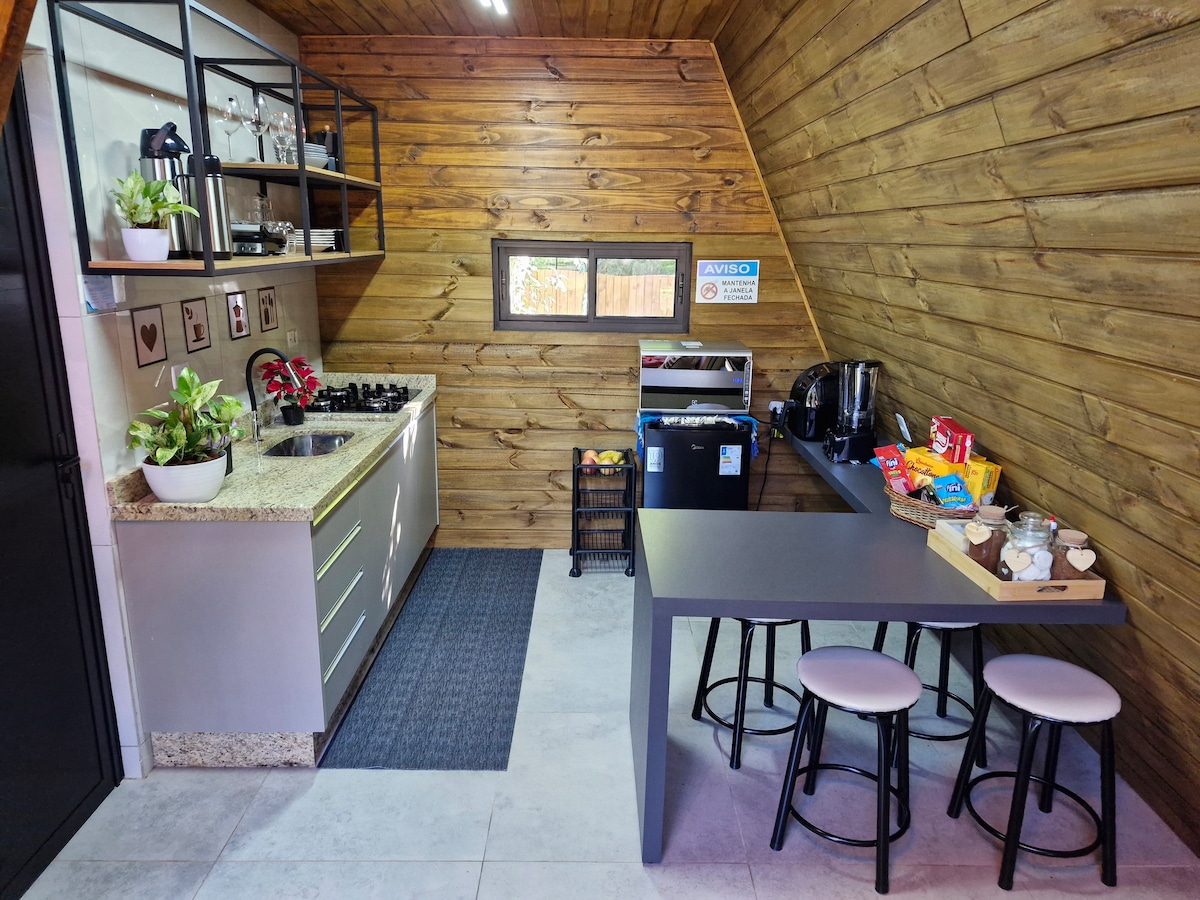 RUANG TAMU EKSKLUSIF di tengah alam! Pondok ini menawarkan hidromassage, perapian, kolam hias, perapian, AC, dan semua kenyamanan yang layak Anda dapatkan. Kabin ini dilengkapi peralatan. Sangat cocok untuk pasangan, keluarga, dan teman - teman. Termasuk keranjang sambutan dengan sarapan, pasar domestik mini, frostboard, dan fondue di tempat. Tempat yang sempurna untuk bersantai, menjalani momen unik, dan terhubung kembali dengan apa yang benar-benar penting.