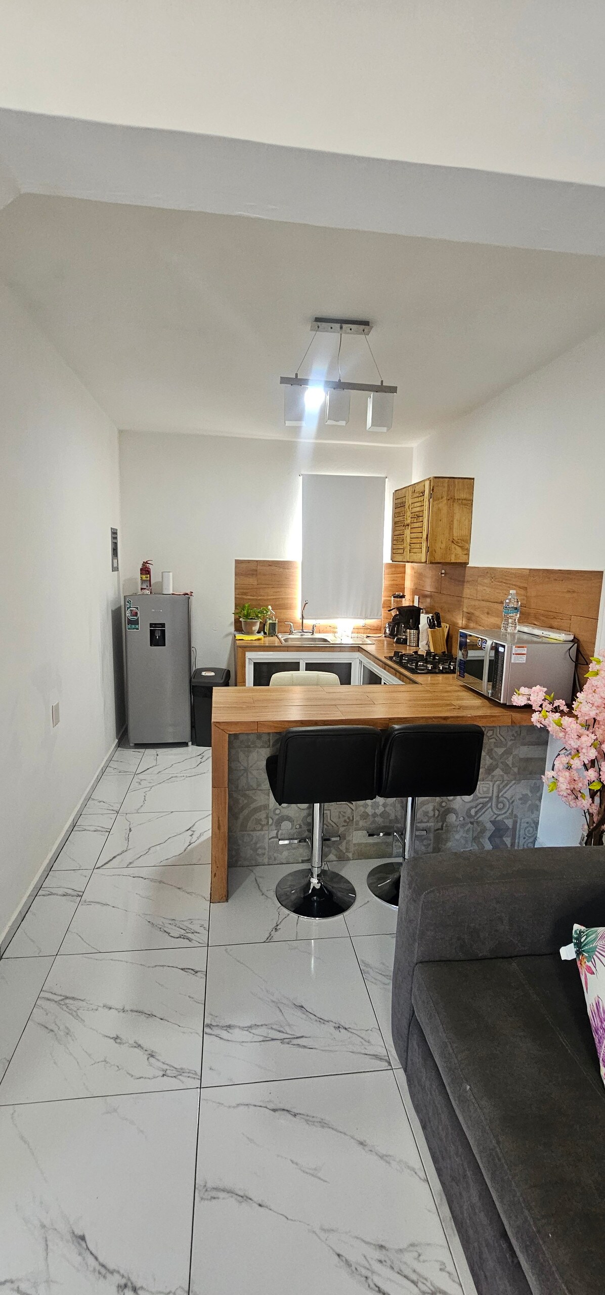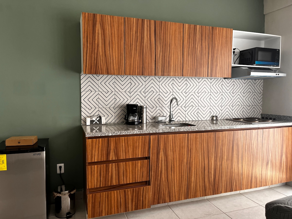 Loteng mini modern/mewah di Veracruz. 1 kamar tidur dengan tempat tidur double dan kamar mandi lengkap. Ruang tamu dengan sofa bed, ruang makan mini, dan 2 TV. Dapur lengkap: minibar, mesin pembuat kopi, dan microwave. Ber-AC lengkap. Akses independen. Lokasi: 1 blok dari Av. Martí, 2 blok dari Blvd. dan pantai, 5 menit ke Akuarium, 12 menit ke pusat kota. Seprai tempat tidur dan handuk disertakan. Nyaman, pribadi, dan berlokasi di pusat kota.