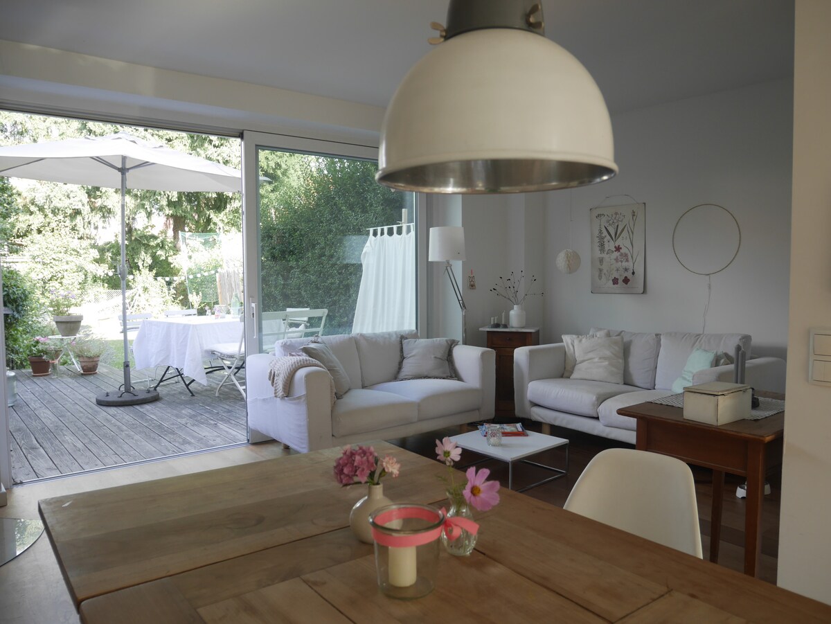 Rumah ini, dikelilingi oleh taman yang dilindungi, terletak di lereng yang cerah di dusun kecil Langackern antara padang rumput dan hutan. Tempat ini menawarkan suasana alam yang istimewa dan kemewahan modern: cerah, luas, menyenangkan, dengan jendela dari lantai hingga langit - langit dan pemandangan indah lanskap yang indah. Dekat dengan kota Freiburg dan pada saat yang sama di tengah - tengah Schwarzwalde, nikmati budaya kota yang semarak dan ketenangan, keheningan pegunungan, hutan, alam yang unik.