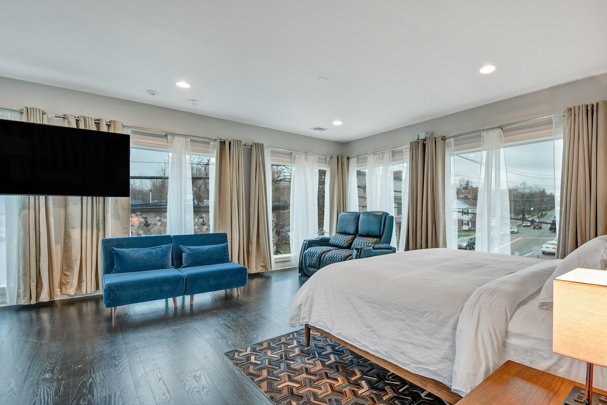 Relax & Indulge in our Luxe Penthouse Studio with Elevator & Parking! Beautifully furnished on Main St. in Warwick- Walk to Everything! Panoramic windows with amazing views over Warwick. Spa steam shower with bluetooth speakers, luxury bath toiletries, Heavenly King bed with Egyptian cotton linens, 65 in. HD Smart TV, reclining leather theater seats, velvet loungers convert into sleepers, fully stocked designer kitchen with all appliances, Nespresso & Keurig, coffee, tea, bottled water included.
