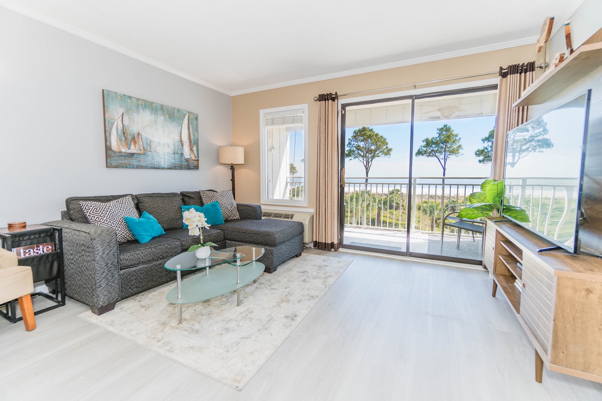 Gated Beach & Golf Resort! ✨Top 5% Airbnb Guest Favorite✨ Beach, Golf, Pool, Spa, Restaurants & Bars FREE Pickleball & Tennis – across the street HGTV Decorator designed Panoramic Golf & Lagoon Views! Big Porch Lush Landscape Tons of Wildlife Coastal Décor Sunny 1st Floor End Unit KING BED + 2 QUEENS 3 XL SmartTVs FAST WIFI & CABLE Chef's Kitchen Washer/Dryer BBQ Beach Cart, Chairs, Boogie Boards, Ice Chest Walk/Bike/Drive to Beach Walk to Golf Club & Pub Close to Coligny Summer Beach Shuttle