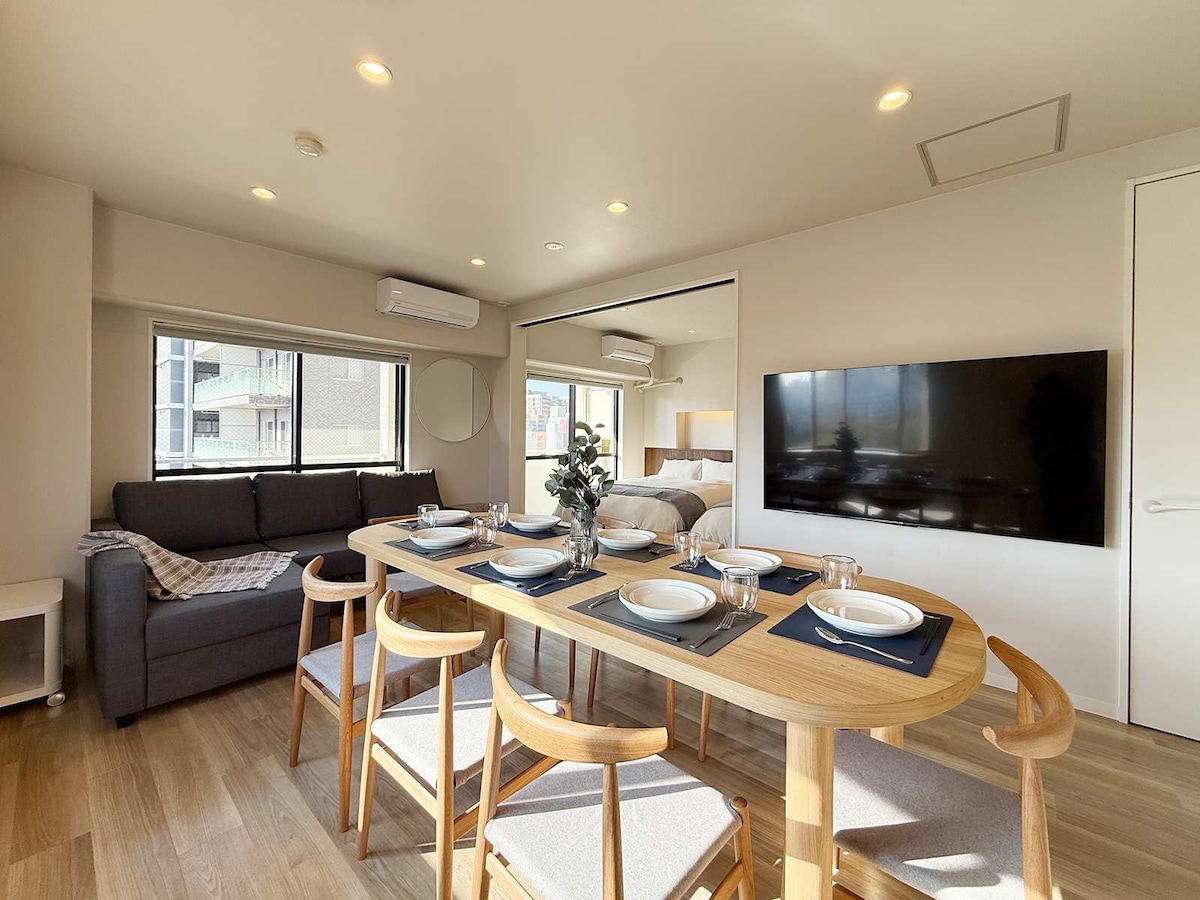 Apartemen studio seluas 55 meter persegi di pusat Hiroshima dengan balkon dengan pemandangan kota. Berlaku untuk 6 ppl. Dengan lift dan fitur smart lock untuk keamanan semua tamu. Wifi kamar disediakan. Dengan fasilitas lengkap: area tamu; ruang makan dan dapur. Dilengkapi dengan mesin cuci. Toilet & kamar mandi terpisah. Perlengkapan mandi juga disediakan. Dikelilingi dengan minimarket dan restoran. Cocok untuk rombongan teman dan keluarga.