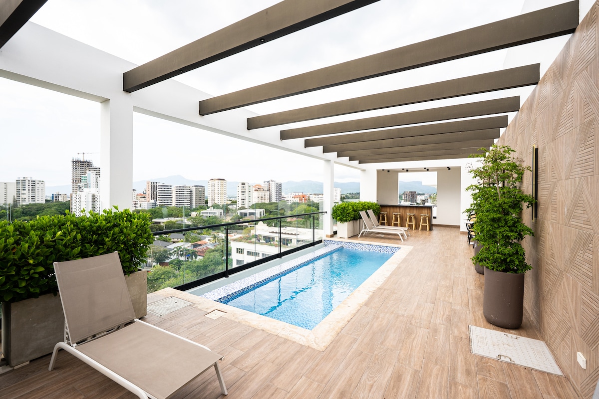 •Terletak di pusat kota Santo Domingo •Luas 810 kaki persegi dengan 1 kamar tidur 1 tempat tidur + 1 tempat tidur sofa •Cocok untuk pasangan dan bekerja jarak jauh •Atap dengan kolam renang, jacuzzi, pusat kebugaran, dan area pijat •Atap adalah ruang bersama -Layanan lobi 24/7 •Dapur dengan semua peralatan dasar •Balkon dengan pemandangan indah •58 smart TV • Wi - Fi nirkabel gratis, Netflix, dan parkir pribadi •Beberapa menit berjalan kaki ke tempat - tempat menarik untuk bersantai, makan, dan berbelanja