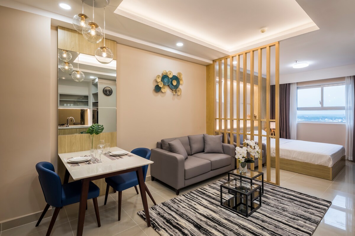 Tempat menginap unik ini memiliki gaya yang sangat pribadi. Apartemen 1 tempat tidur, terletak tepat di lantai 4 (Lantai utilitas bangunan: Akses mudah ke kolam renang, area bermain anak - anak, taman bunga, area BBQ luar ruangan, sauna, GYM), lokasi pusat kota secara teratur berlangsung pada konferensi, komersial, pertemuan layanan. Ada bus gratis ke pusat Ho Chi Minh dan sebaliknya.
