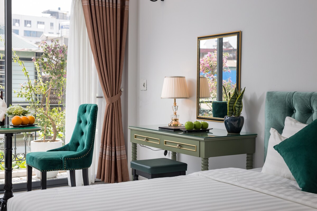 Dengan perpaduan kenyamanan kontemporer dan pesona tradisional, hotel bintang 4 kami terletak di jantung Old Quarter yang bersejarah di Hanoi. Kamar Deluxe kami dengan Balkon menawarkan liburan mewah, menampilkan interior yang luas dengan tempat tidur berukuran king yang nyaman dan fasilitas modern. Balkon pribadi untuk menikmati pemandangan panorama Old Quarter Hanoi yang menawan, menjadikannya tempat sempurna untuk bersantai setelah seharian menjelajah.