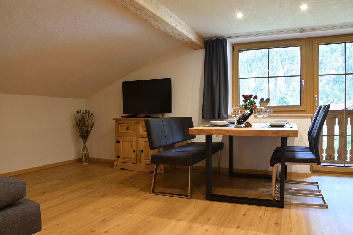 Apartemen yang indah dan berperabot ini untuk 4-5 orang terletak di lantai pertama dan memiliki dua kamar tidur (untuk 2 dan 3 orang) serta dapur yang nyaman. Dari area duduk/makan yang nyaman, Anda dapat melihat gereja desa dengan latar belakang Jöchelspitze. Dapur dilengkapi dengan kompor 4 api, kulkas dengan kompartemen pembeku, mesin cuci piring, dan oven. Tersedia ketel dan mesin kopi Nespresso. Apartemen ini memiliki kamar mandi mewah dan toilet terpisah.