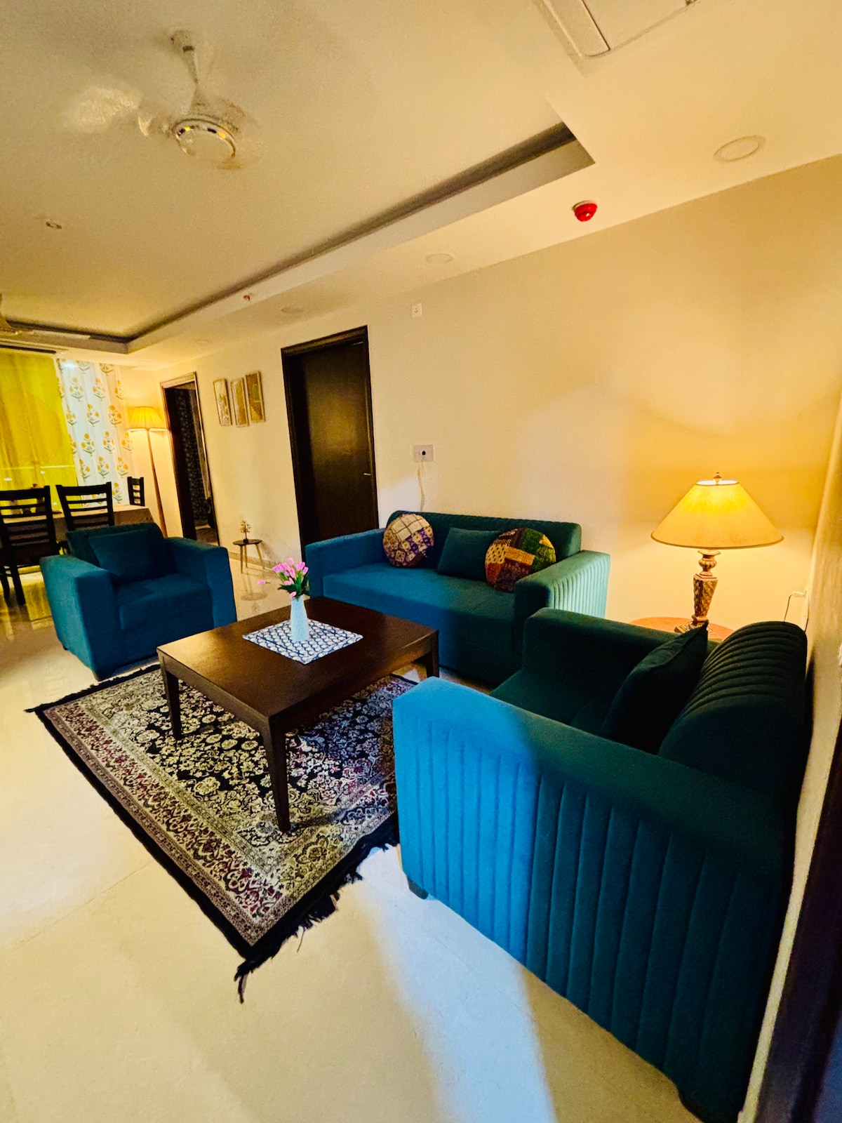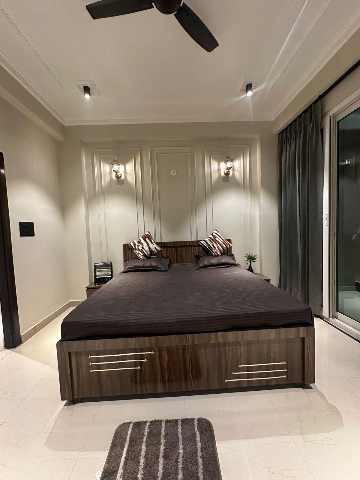 Nikmati masa inap yang nyaman dan bergaya di apartemen mewah 1BHK yang modern dan luas ini, yang dirancang dengan cermat untuk menampung hingga 4 tamu. Tempat tidur berukuran king yang nyaman, sementara area tamu mencakup sofa cum bed berukuran king, menjadikannya ideal untuk keluarga, pasangan, atau rombongan kecil. Apartemen ini menawarkan dua kamar mandi premium, memastikan kenyamanan dan privasi. Dapur lengkap memungkinkan Anda memasak dengan mudah dan melangkah keluar ke area duduk luar ruangan yang tenang, cocok untuk teh pagi.