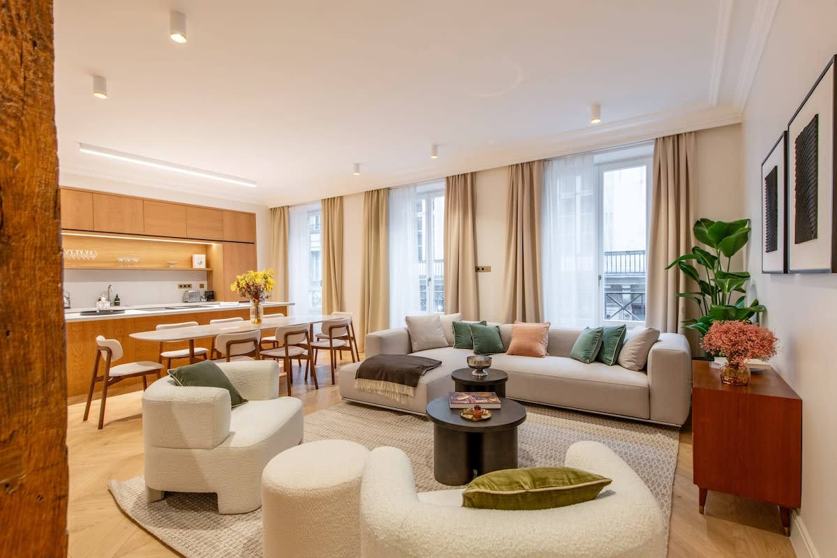 Harap perhatikan bahwa pekerjaan renovasi pada fasad gedung selesai pada 20 Agustus 2025. Apartemen mewah seluas 150 meter persegi, direnovasi sepenuhnya dan dirancang oleh arsitek sebagai suite hotel, dengan AC sentral, teras pribadi dan terletak di lantai 2 (dengan lift) bangunan yang indah, bersejarah, dan aman. Berlokasi ideal di arondisemen ke -2 Paris, di sekitar Place de la Bourse, Palais Royal, dan Opéra Garnier.