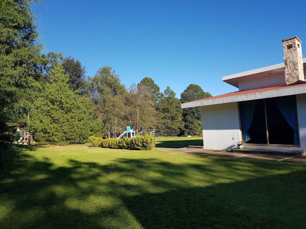 - Relájate en este espacio tan tranquilo y elegante. - Es un lugar muy espacioso para pasar tu fin de semana en compañía de tu familia, disfruta de un juego de billar, con el toque perfecto de una chimenea por la noche y un muy buen desayuno en el jardín por la mañana. - Relajación al máximo en el jacuzzi, en la recamara principal. - Disfruta de la vista y la tranquilidad en el espacio de lectura en la planta alta. - Disfruta de unos deliciosos bombones asados en el fogatero.