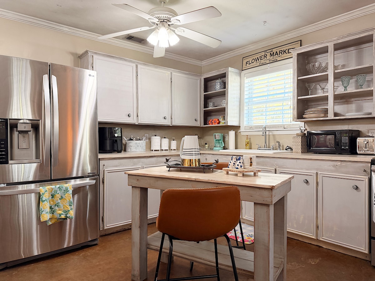 This Farmhouse Cottage is just right for one person or a couple! Located just outside the city limits and close to anywhere in town, yet nestled in on the back of our property under the oaks and pines and looking out over the pasture. Come stay with us next time you come to town!
