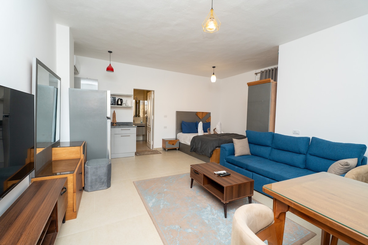 Beristirahatlah dan bersantai di ruang damai dengan akses kolam renang. Studio menawarkan masa inap yang hangat dengan semua fasilitas untuk menjadi rumah abadi Anda. Studio menawarkan: 1. Tempat tidur queen. 2. Sofa Bed. 3. Smart TV. 4. Dapur. 5. Meja makan. 6. Kamar mandi. 7. Wifi. 8. Mesin cuci. catatan penting: Surat nikah resmi diwajibkan untuk warga Mesir. (Orfi tidak diperbolehkan)