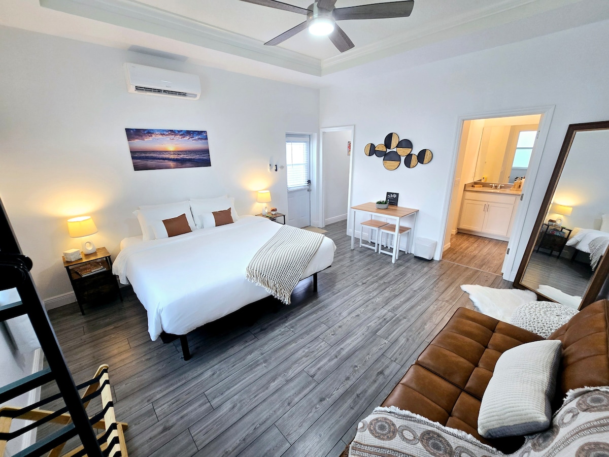 Bersantai di suite tamu Cal King yang memadukan kemewahan modern dengan lingkungan sekitar yang membangkitkan bioskop klasik. Nikmati cangkir pagi Anda dengan pemandangan alam. Benamkan diri Anda di pemandian seperti spa dunia lama dengan bak mandi dan shower yang terlalu besar. Handuk mewah, bar kopi lengkap, smart tv, WIFI berkecepatan tinggi, AC split & dapur kecil. Pribadi; di luar pintu masuk & tidak ada dinding umum dengan rumah utama. Lingkungan tinggal yang tenang di sebelah VB Country Club. Parkir di depan, tidak ada tangga. 1,5 mil ke pusat perbelanjaan, jembatan Barber & Royal Palm Pt.