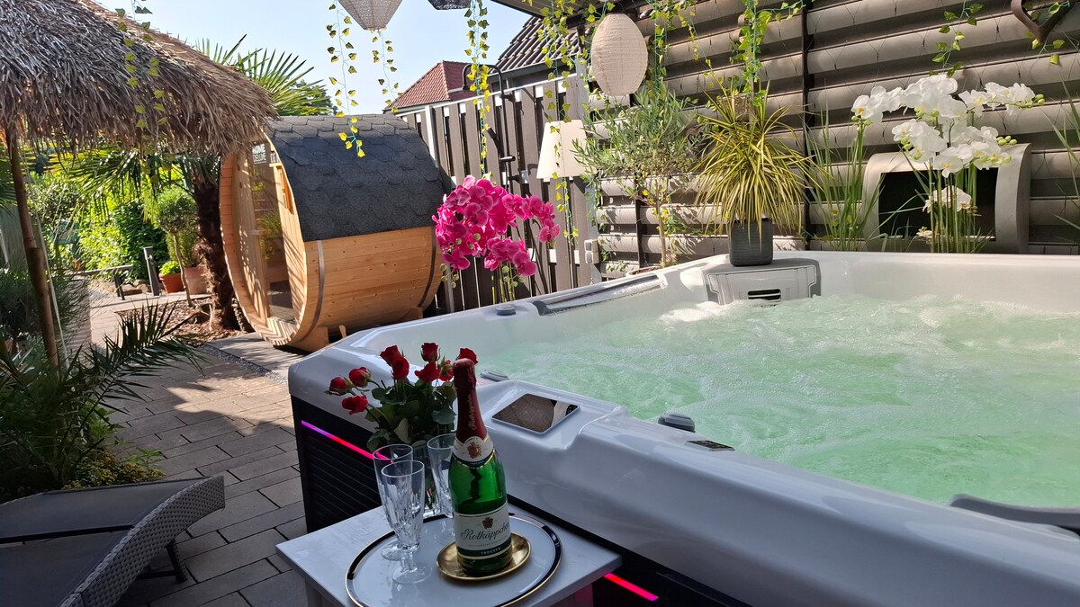 Romantik, relaksasi mewah, kolam pusaran air, perapian sauna