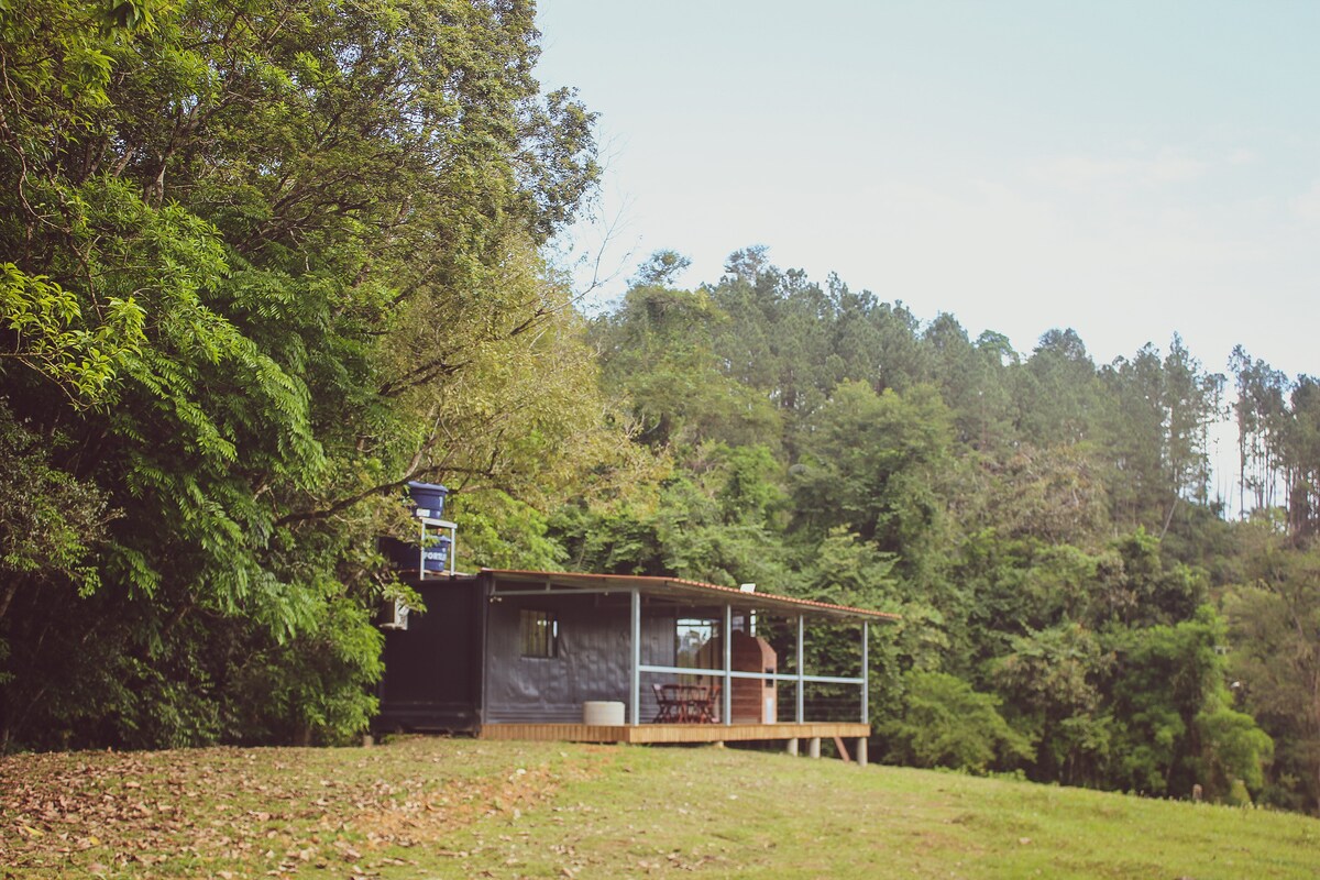 Bem-vindo ao nosso refúgio na natureza. Uma cabana container combina design contemporâneo com beleza natural. O interior aconchegante oferece uma cozinha e uma vista panorâmica do lago. Relaxe na hidromassagem privativa e diversão do conforto do banheiro bem equipado. À noite, acenda uma fogueira sob um céu estrelado. A localização privilegiada oferece acesso a uma cachoeira deslumbrante e a um rio para pescaria. Seja para um refúgio romântico ou aventura em família viva esta experiência.
