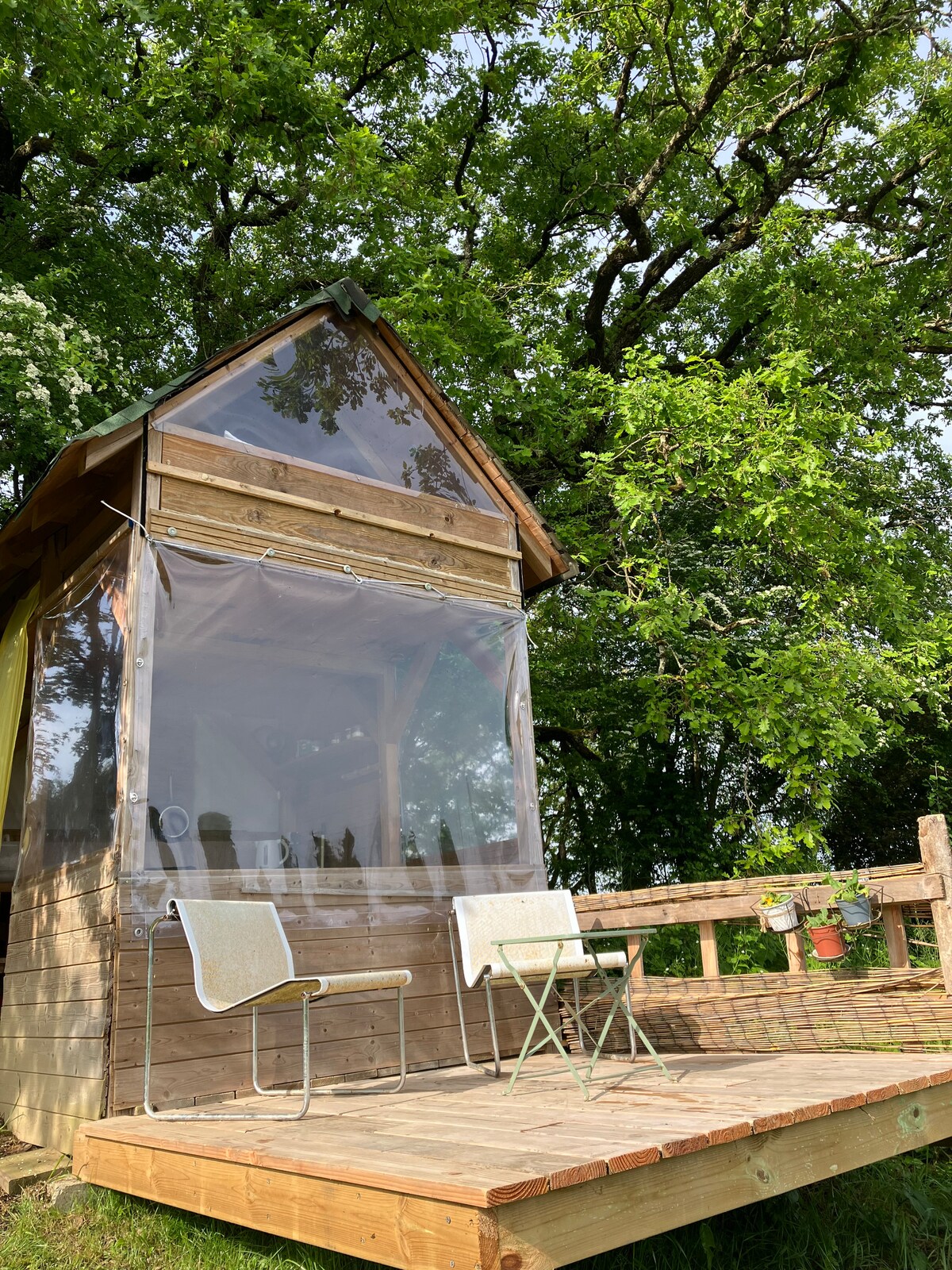 Akomodasi tipe kabin kecil, dua TEMPAT tidur berukuran 80x190 dengan akses tangga. Area makan dan dapur di tempat berlindung. furnitur luar ruangan dengan teras. Ketel listrik, plancha, piring, peralatan makan. Dalam kabin tipe Bivouac perlu menyediakan kantong tidur atau duvet dengan seprai, dan handuk mandi. Kamar mandi dan toilet kering adalah umum dan di luar ruangan, menghadap alam dan terletak dalam jarak 30m.