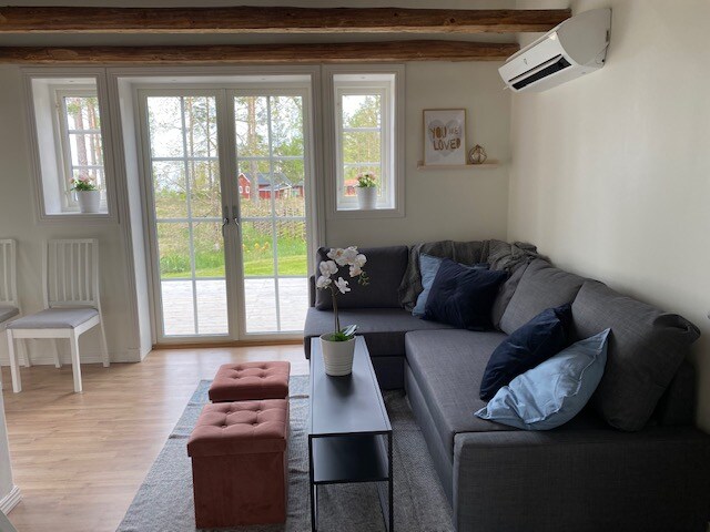 Welcome to Sörgården and our horse farm! Enjoy all four seasons from the top floor, with a stunning view of Lake Bottensjön to the west. This modern house from 2022 offers 45 sqm of living space. The apartment shares the building with two other units. Perfect for 3 adults or 2 adults and 2 children. One bed is a sofa bed, which may not suit two adults. Feel free to book our floating sauna on the lake – 500 SEK per session. Relax and enjoy the unique tranquility by the water!