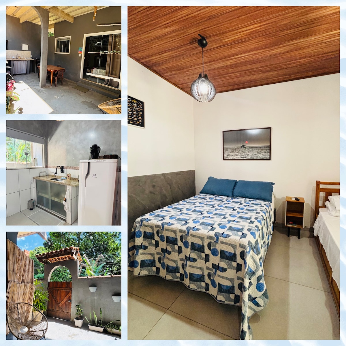 Lokasi terbaik!! Pusat dan hanya beberapa langkah dari pantai Abraham. Suite dengan dapur, area luar ruangan dengan pancuran dan barbekyu, semuanya pribadi. Tidak boleh dilewatkan!!! smartTV, WI-FI, 1 tempat tidur double dan 1 tempat tidur single yang sangat nyaman (kami menyediakan seprai dan handuk) AC inverter split dan kipas angin langit-langit. Pintu masuk bersifat pribadi. Ideal untuk pasangan dan/atau pasangan dengan anak - anak, karena ruang asrama yang beredar. Sangat cocok untuk bersantai dan menikmati yang terbaik dari Ilha Grande.