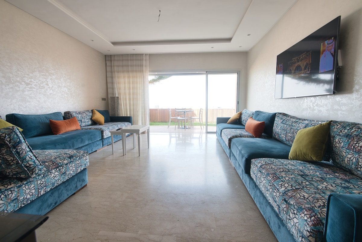 Apartemen yang nyaman, dekat pantai dengan 2 kamar tidur (muat 5 orang), ruang tamu, dapur dan kamar mandi, serta kamar mandi dengan pancuran walk-in dan di balkon ada kolam Jacuzzi yang bagus dengan pemanas zellige Maroko pada suhu kamar (kosong pada bulan Desember, Januari, Februari) Tempat tinggal diamankan oleh kamera , dan pengurus , parkir gratis di tempat tinggal . toko - toko di ujung jalan , apotek , toko daging toko kelontong... pusat air