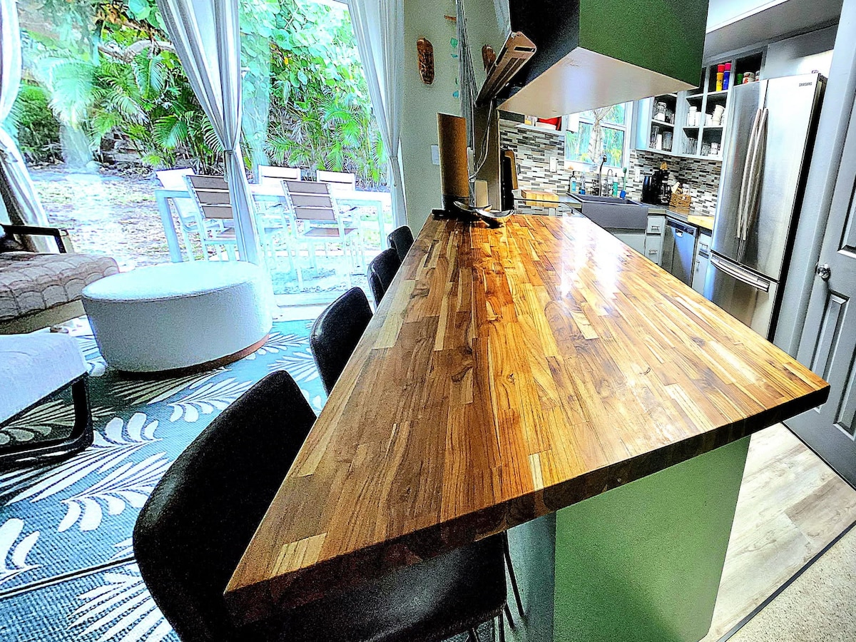 Nestled in a cozy tropical barrier reef island, just a 10-15 minute walk to the parks, beach, restaurants, shopping, river/lagoon, pool & nightlife. Individually owned, our quiet beachside home offers plenty of room, privacy & comfort; with a Sleep Number bed, recently updated & fully equipped kitchen, 2 living rooms, patio, laundry room, 2 car garage, 1 Gig internet, HBO max, Spectrum TV & 6 smart TVs. Premium beach parks, outdoor showers & board walks. Pet friendly home & community.