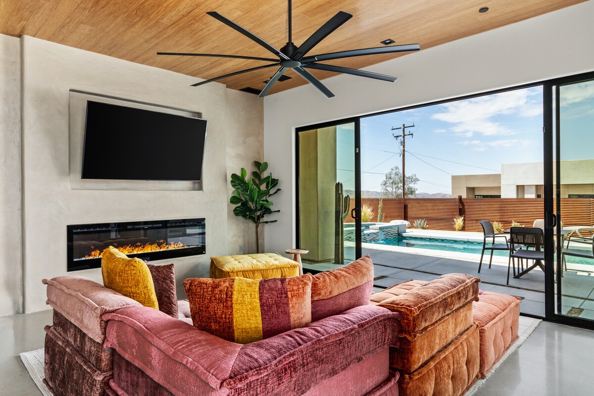 Welcome to Night Fall, a luxury desert escape with high-end amenities and a designer pool, located just outside Joshua Tree National Park. We get it, you didn't come to the desert to stay inside, so come unwind in our resort-style backyard. Highlighted by our pool, spa, sauna and game room garage with Ping Pong! We've loaded this home with activities for all ages, so no one will ever say "I'm Bored!" This isn't your typical dusty, desert rental. It'll impress even the harshest critics!