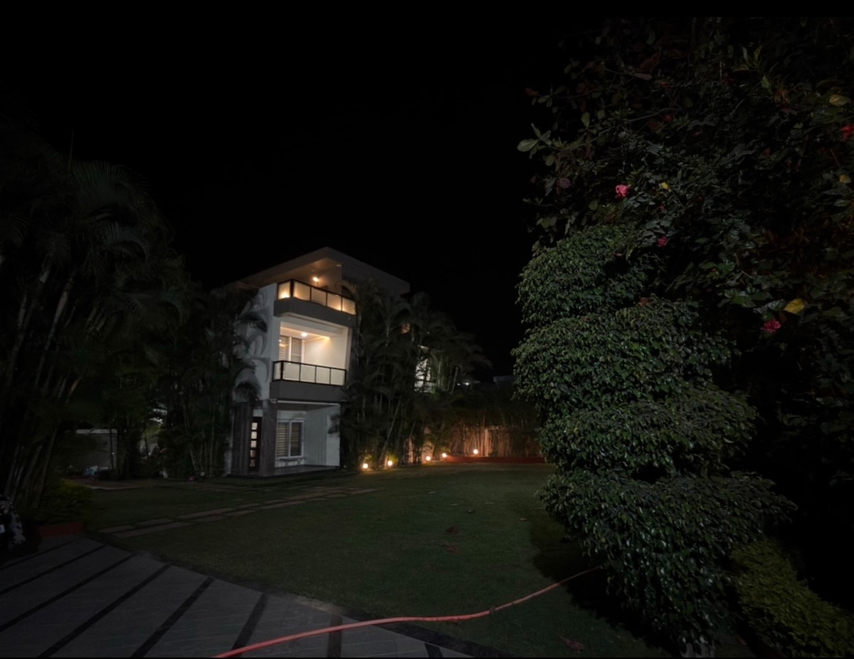 A Luxurious Architectural Retreat in the Heart of Indore This stunning 8,500 sq. ft. bungalow is a fusion of modern sophistication and timeless charm, designed by the Hosts who are renowned architects. The bungalow offers easy access to Indore’s vibrant markets and landmarks. It has four spacious bedrooms with attached bathrooms. Spaces include a cozy living room, a formal sitting area and a kitchen, Garden, A 2,000 sq. ft. balcony offers a perfect spot for sunset views, or stargazing.