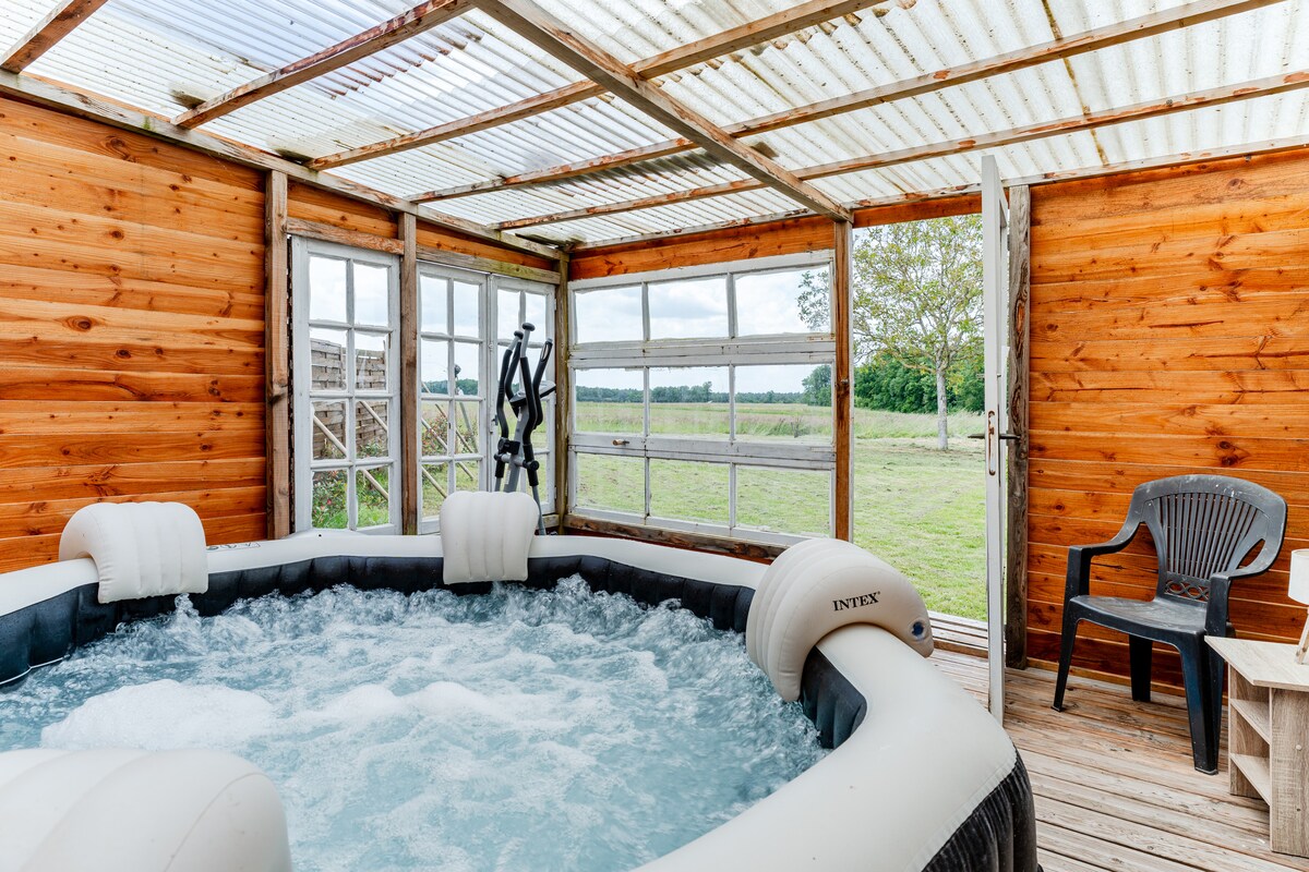 Rumah satu kamar tidur yang baru direnovasi dengan jacuzzi/bak mandi air panas pribadi dan pemandangan indah di seberang kolam renang, lubang barbekyu, dan jacuzzi yang meluap. Rumah ini terletak di lokasi chateau abad ke -15 tua dan peternakan pejantan di lebih dari 40 hektar pedesaan yang indah dan jalan - jalan yang indah. Kamar mandi dalam dan dapur mewah yang menakjubkan. Tempat tidur berukuran king dengan kasur ortopedi dan seprai Mesir. Semua handuk, termasuk handuk kolam renang disediakan Tempat tidur sofa untuk 2 tamu tambahan.