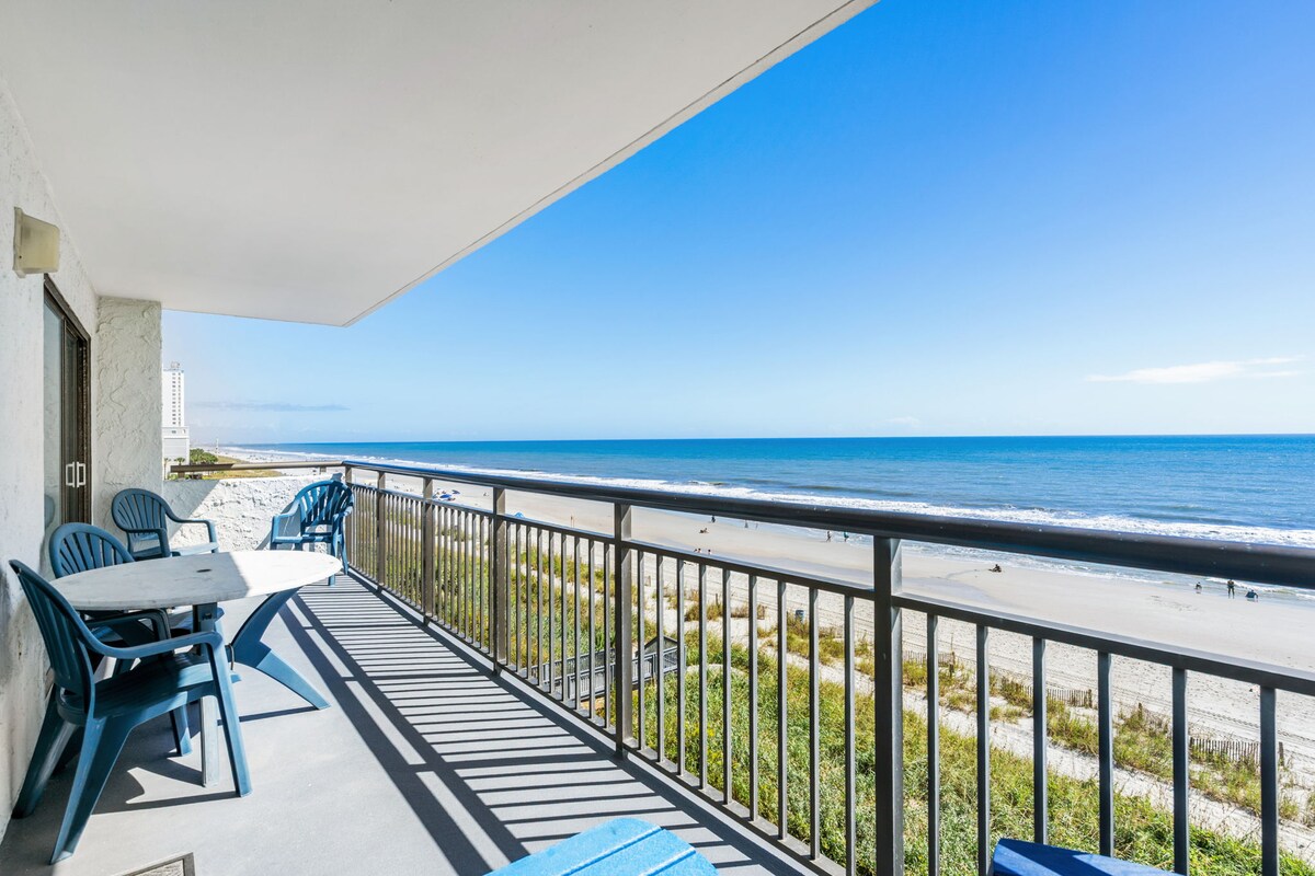 BUKAN 4 tempat tidur, kesalahan teknologi - 23+ tahun untuk disewa per HOA Studio Balkon Oceanfront memiliki tempat tidur King yang ditinggikan dengan pemandangan laut. Tempat tidur double di bawah - di atas roda untuk akses yang mudah. Smart TV 55" yang dipasang di dinding dan dapat diputar. Dapur baru dengan peralatan, mesin cuci piring & 4 bangku konter. Pancuran mandi walk-in, tirai blackout. Pack & play, 2 kursi pantai & payung untuk tamu = hemat besar. Oasis Spektakuler, Sangat Cocok untuk Pasangan, Perjalanan Perempuan/ pasangan dengan anak kecil. Cocok untuk 2 orang dengan nyaman. Ini studio. Hanya 2 tempat tidur