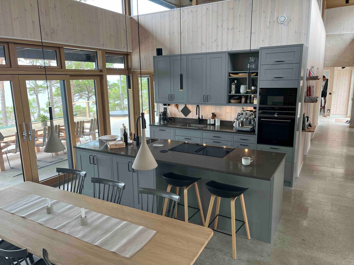 Selamat datang di rumah impian kami yang dirancang oleh arsitek seluas 110 meter persegi. Rumah ini dibagi menjadi tiga kamar tidur, jeruk, kamar mandi, dapur, ruang makan dan ruang tamu di loteng. Dari loteng Anda juga keluar di teras atap yang memiliki pemandangan Laut Baltik yang luas. Jeruk mengkilap adalah penghubung antara ruang bersama dan area kamar tidur. Di sini Anda bisa duduk dan menyaksikan bintang - bintang atau menyalakan api di perapian. Kamar mandi memiliki bak mandi batu kapur yang cekung. Bungenäs adalah area unik yang bebas dari mobil, parkir 800 meter dari rumah.