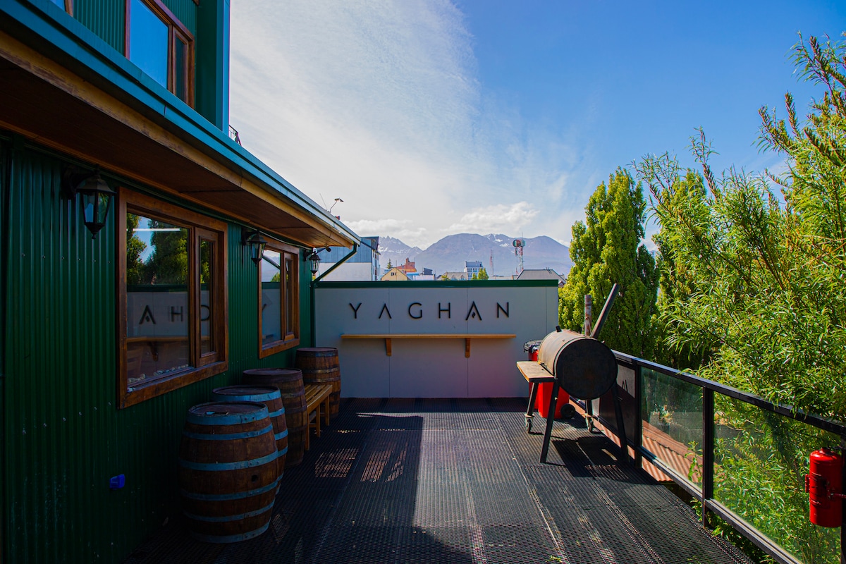Habitación doble en Suite con baño privado en hostel en Ushuaia, ideal para parejas o amigos que buscan aventura. Puede configurarse con cama matrimonial o dos camas individuales. Un espacio cómodo para descansar después de trekking, ciclismo o actividades al aire libre. YAGHAN es un hostel céntrico, con espíritu joven y ambiente viajero, donde se comparten asados, experiencias y buena energía. Ubicado a una cuadra del centro de Ushuaia, con fácil acceso a excursiones y servicios.