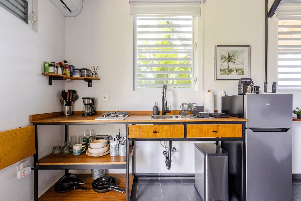 Rumah mungil mandiri berukuran 10'x16' ini adalah tempat unik di atas gunung dengan segala yang Anda butuhkan untuk bersantai di luar rumah. Pemandangan hutan hujan Nasional dan garis pantai sangat menakjubkan. Sonadora creek berbatasan dengan halaman belakang seluas 7,5 hektar dan dapat diakses melalui beberapa jalur di properti. Dapur kecil dilengkapi dengan peralatan lengkap untuk kenyamanan Anda. Jaraknya 29 menit ke terminal Feri ke Vieques/Culebra, 28 menit ke Seven Seas dan 41 menit ke El Yunque.