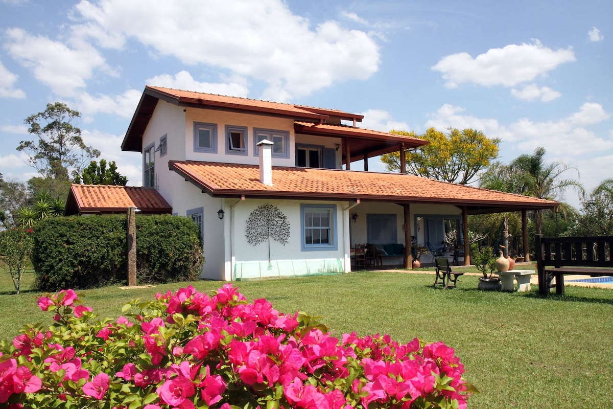 Temos outros anuncios com mínimo de 2 ou 7 dias me envia mensagem que eu te mando) Linda casa de campo. Silêncio, paisagens e muita paz. Aproveite a piscina privativa, cozinha externa, churrasqueira de chão Hospeda até 8 pessoas, 3 quartos, sendo 1 suíte. Sala grande, sala de jantar, cozinha com balcão americano piscina, varandas grandes. Jardins por toda a área e segurança 24h. Possui TV e todo aparato de cozinha e 3 banheiros. Não eh permitido visitação, nem festas abertas.