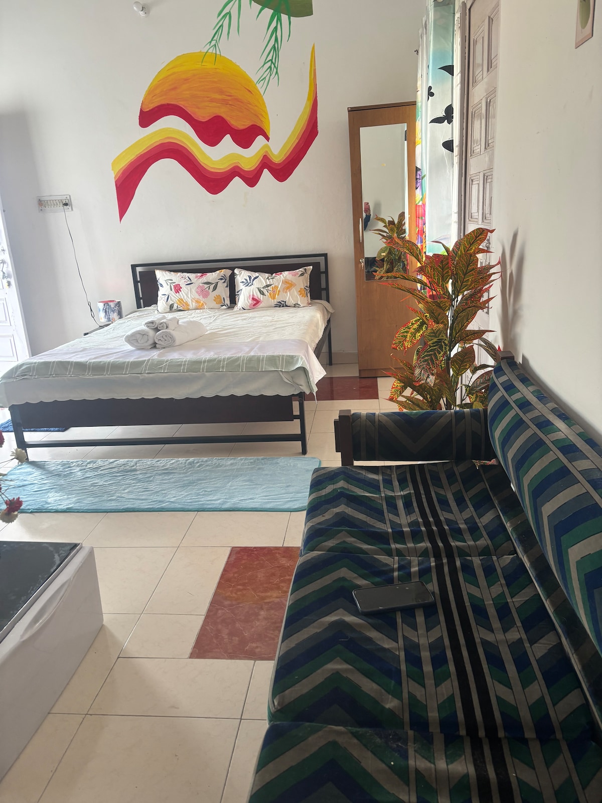 Selamat datang di penthouse nyaman kami di lantai kedua, dengan pintu masuk pribadi dan patio yang menawan. Rumah ini menawarkan 2 kamar tidur ber - AC, masing - masing dengan tempat tidur King, 2 kamar mandi (satu terpasang, satu di ruang tamu), dapur dengan filter air RO, dan area umum kecil dengan kulkas. Wi - Fi Airtel berkecepatan tinggi dan meja kerja juga disediakan. Harap perhatikan: Jika memesan untuk 1 -2 tamu, 1 kamar tidur dan kamar mandi akan tetap ditutup untuk pengalaman yang lebih disesuaikan.