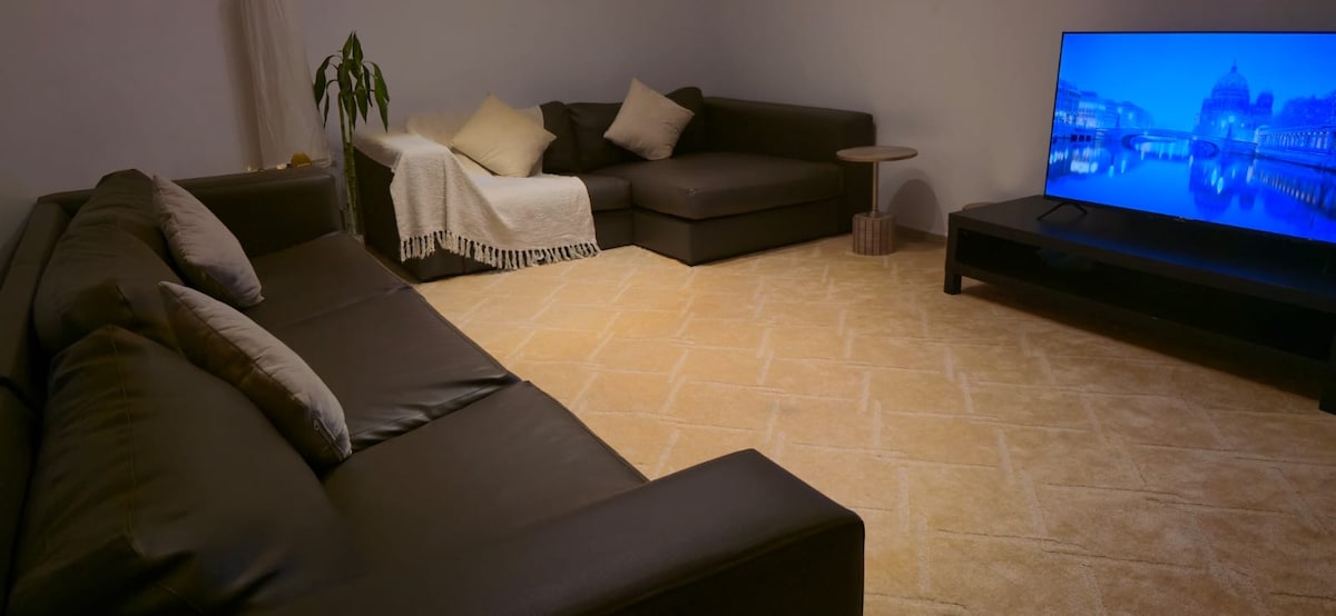 Studio yang luas dan tenang, dengan tempat tidur besar di tengah yang memberikan perasaan nyaman, dan di sebelahnya terdapat area duduk yang elegan dengan sofa yang nyaman dan meja samping yang sederhana. Tempat ini praktis dan jelas terkoordinasi, dan pencahayaannya menyenangkan, memberinya karakter yang hangat dan nyaman. 1,9 km dari tempat parkir Kadi, halte bus terdekat berjarak 100 m, 500 m dari jalan setapak Bataha Quraish..