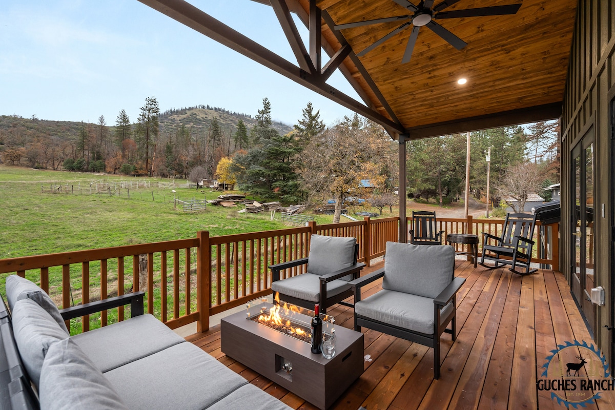 Enchanting, large, private 1 bedroom guest suite with a view In Upper East Medford. Beautiful, open concept living /dining area has plenty of room to relax and unwind. This space also includes a semi private queen bed. There is a large luxurious shower, kitchenette, and other amenities (microwave, fridge, and coffee maker). Outside there is a large private covered deck with outside seating and a fire pit. Close to wineries, golf, restaurants, and great hiking. This is a non smoking property.