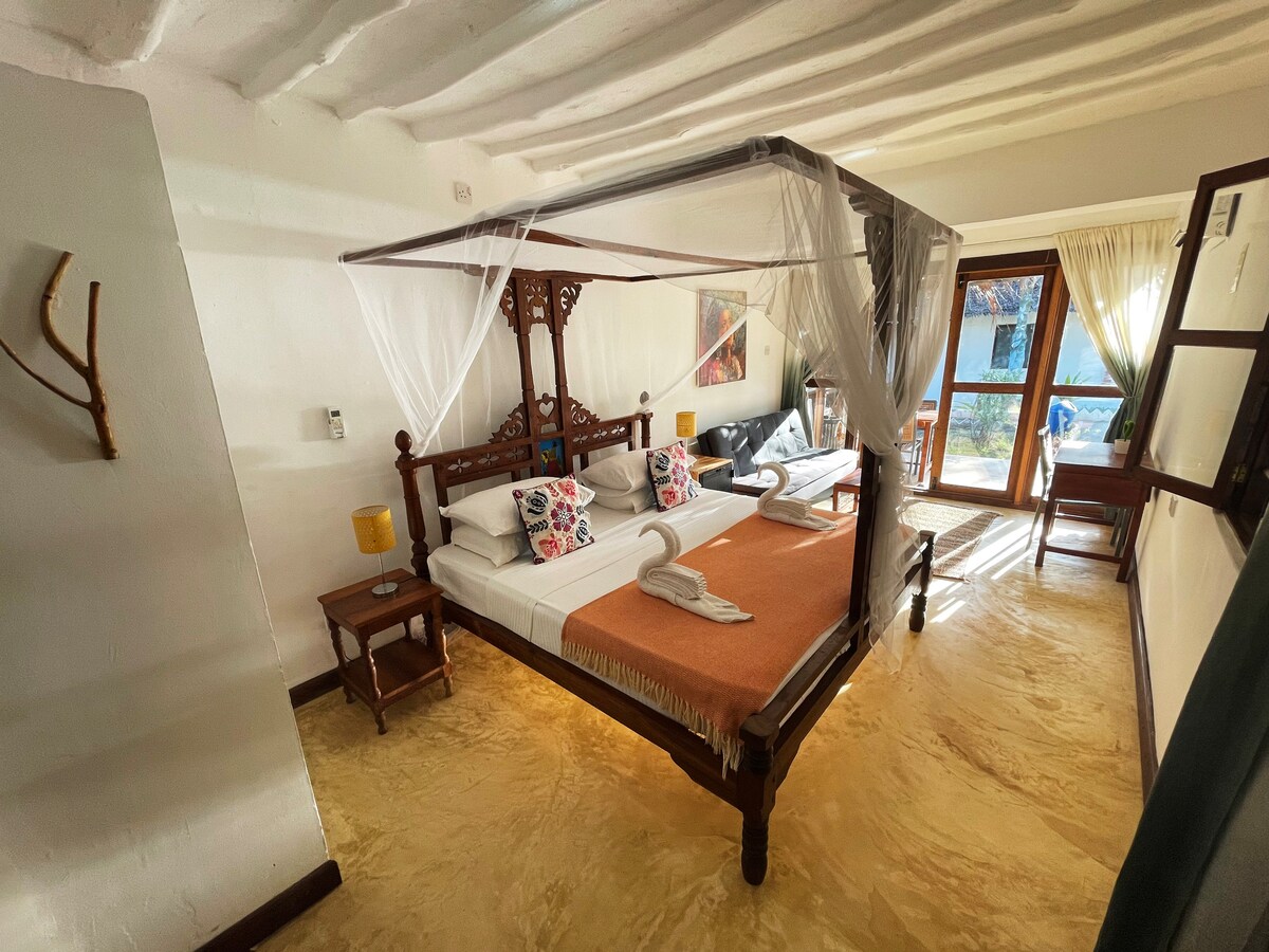 @VillaAmaya_zanzibar, located in the most friendly village in the South East Coast, with all local shops and amenities at walking distance. This beautiful huge 1st floor master bedroom has a comfortable and very large 6x7 ft bed, plus a small single bed and an ensuite bathroom. With a large terrazo bathtub and lots of wardrobe space. All doors are mosquito netted. Breakfast included. Fitted with solar energy. Garden and kitchen shared communal space which you’re welcome to use.