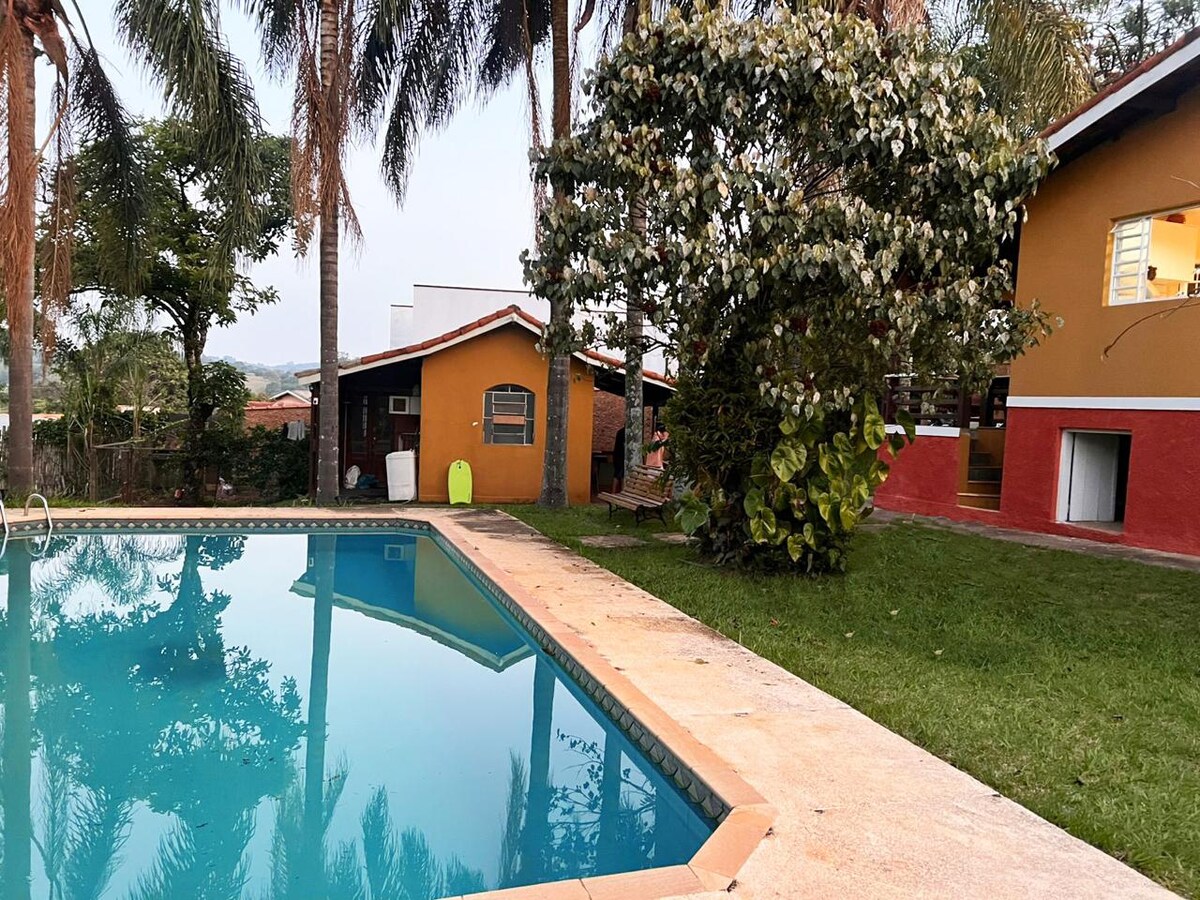 Bersantai bersama keluarga dan teman - teman Anda di ruang besar dengan rumah kantor pusat dengan empat kamar tidur, ruang tamu 03 kamar dengan perapian, TV, dan internet WiFi. Area gourmet dengan barbekyu, oven dan kompor kayu, ruang permainan dengan meja biliar dan ping pong; Kolam renang ber - AC dengan pemanas matahari dan pemandangan panorama yang menakjubkan! Tempat yang benar - benar sempurna untuk beristirahat tetapi juga bersantai dan bersenang - senang! Tempat dengan banyak privasi, area hijau, wisata, dan KEAMANAN untuk keluarga Anda! Dan semua ini dekat SP =)