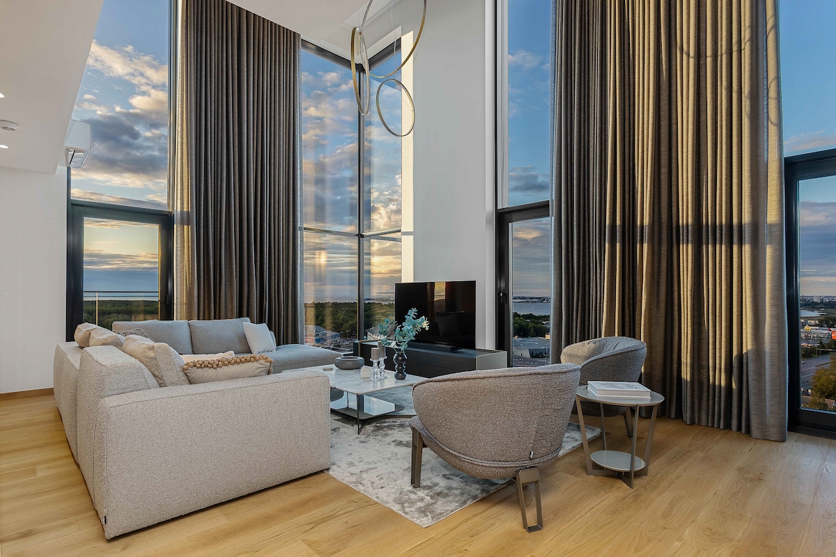 Penthouse elegan, pemandangan kota panorama & sauna.