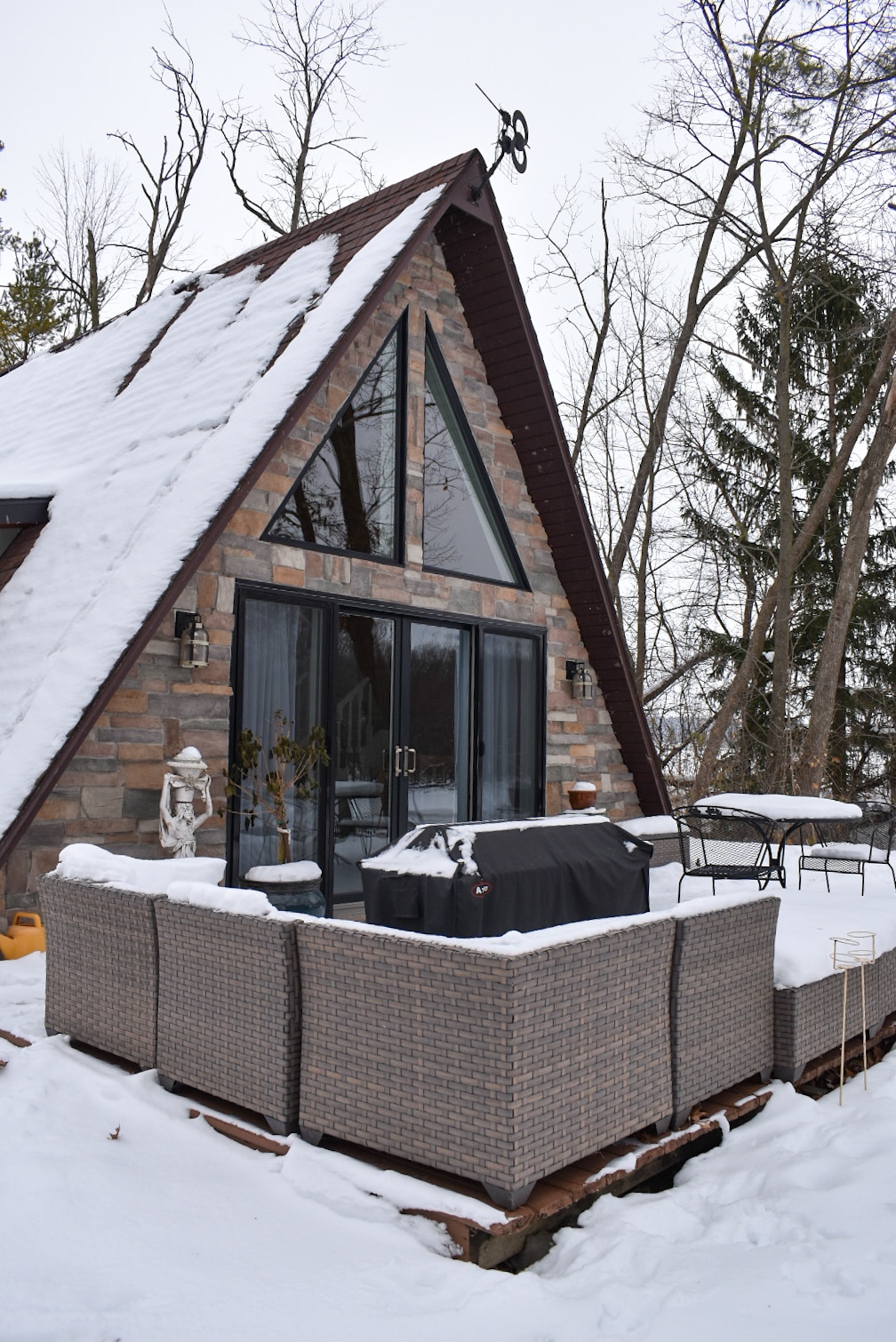 Liburan Musim Dingin A-Frame dengan Sauna + Pemandangan Sungai