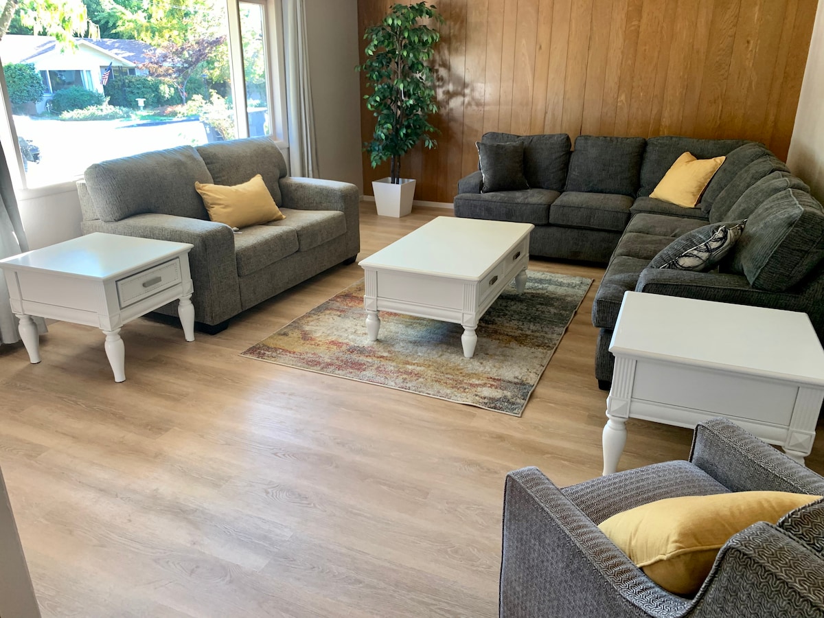 Mid Century Modern ideally located near shopping and Interstate 5. This 1960's home is completely updated with modern appliances while retaining it's 1960's charm. Three bedrooms, large front room with a 65" smart TV, fantastic cooking space, large completely fenced and private back yard , hot tub with 32" smart TV make this a fantastic base for exploring the three local rivers, or a dash to the beach and a stroll through the redwoods. *Pets- $45 additional per pet cleaning fee. Limit 2 please