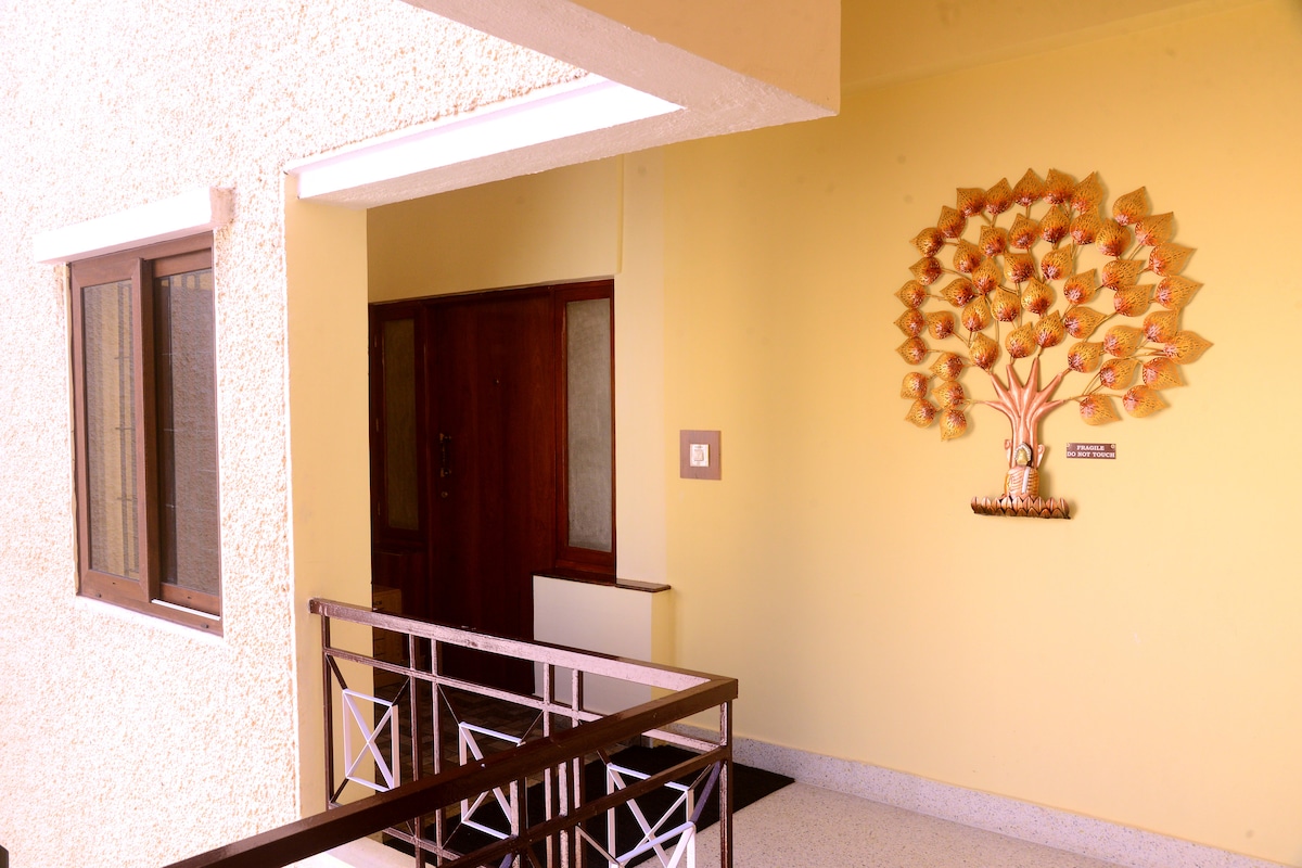 Selamat datang di flat 1 - BHK kami yang baru direnovasi dan luas, ideal untuk pasangan dan keluarga yang mencari kenyamanan dan kemudahan. Kamar tidur ini menawarkan tempat tidur queen dan kasur ortopedi lembut untuk tidur malam yang nyenyak. Bersantai di ruang tamu besar dengan Smart TV 43 inci, WiFi secepat kilat, dan area kerja khusus. Dilengkapi dengan kamar mandi super bersih yang dilengkapi dengan perlengkapan dasar. Dapur berfasilitas lengkap mencakup bahan - bahan dasar, peralatan berkualitas tinggi, dan peralatan makan untuk petualangan kuliner Anda.