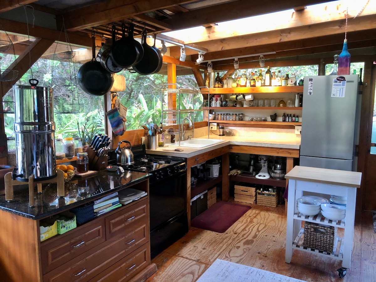Rumah Peristirahatan Mewah di Hutan Hujan Buatan Seniman Dekat Taman Nasional Gunung Berapi Ditampilkan di Discovery Channel (Building off the Grid), tempat peristirahatan hutan hujan yang dirancang oleh seniman di dekat Taman Nasional Gunung Berapi Hawaii ini memadukan kehidupan berkelanjutan dengan kemewahan bergaya pulau—tempat liburan yang damai dan dikelilingi hutan hujan asli. Terletak di 3 hektar pribadi di lereng Kīlauea, rumah 2 kamar tidur buatan tangan ini bisa menampung 6 orang. Dengan kenyamanan modern & desain artistik yang apik, tempat ini menawarkan penginapan yang benar-benar unik di Pulau Besar.