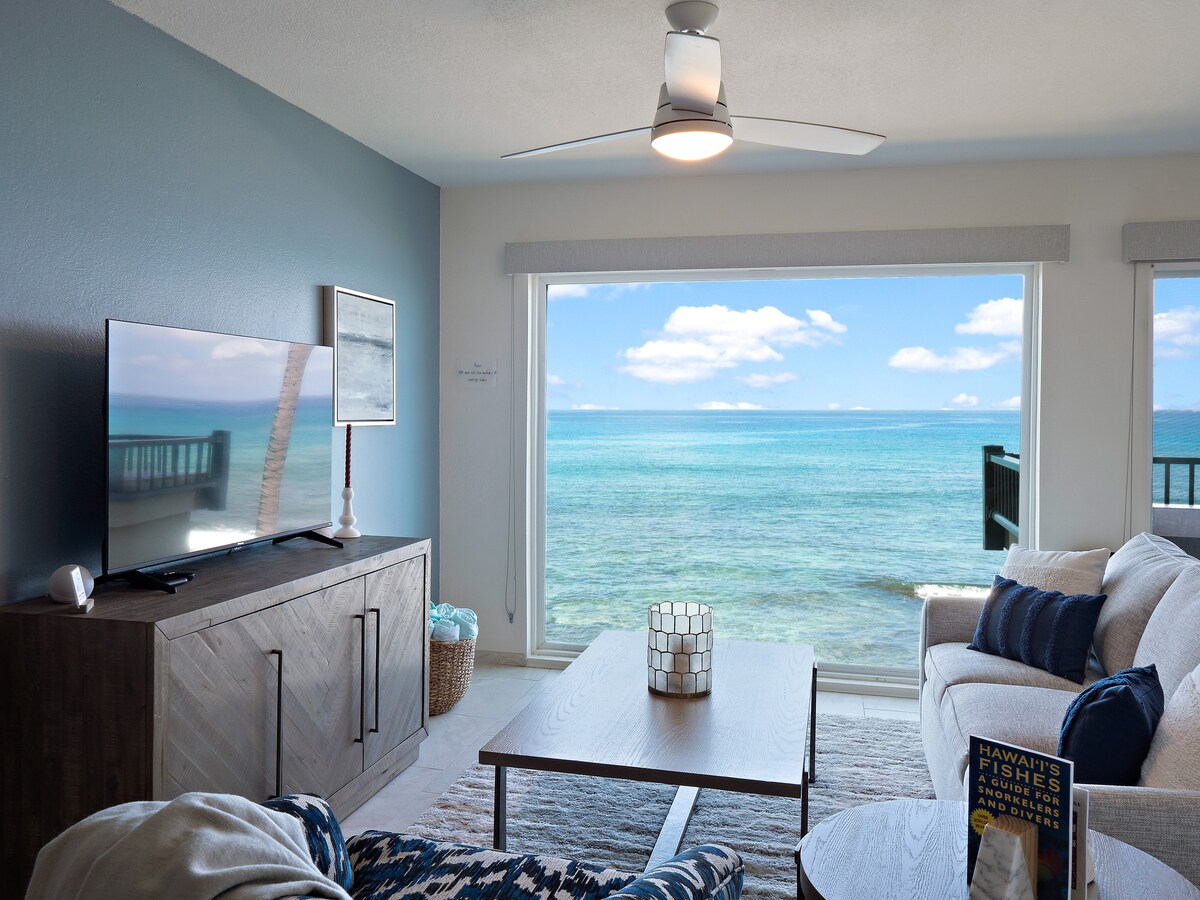 Waterfront cottage on private, gated 1 acre estate. Close as you can get to an over the water bungalow in Hawaii with direct ocean access to swim, surf, kayak, snorkel and watch dolphins. Walking distance to manta ray, snorkeling, kayak, whale and dolphin tours, golf, restaurants, movie theater, and outdoor art market. Two room suite. Queen bed. Living room with 50 in TV. Bathroom with large shower. Large covered deck with seating area, kitchenette, dining table, lounge chairs. Outdoor shower.