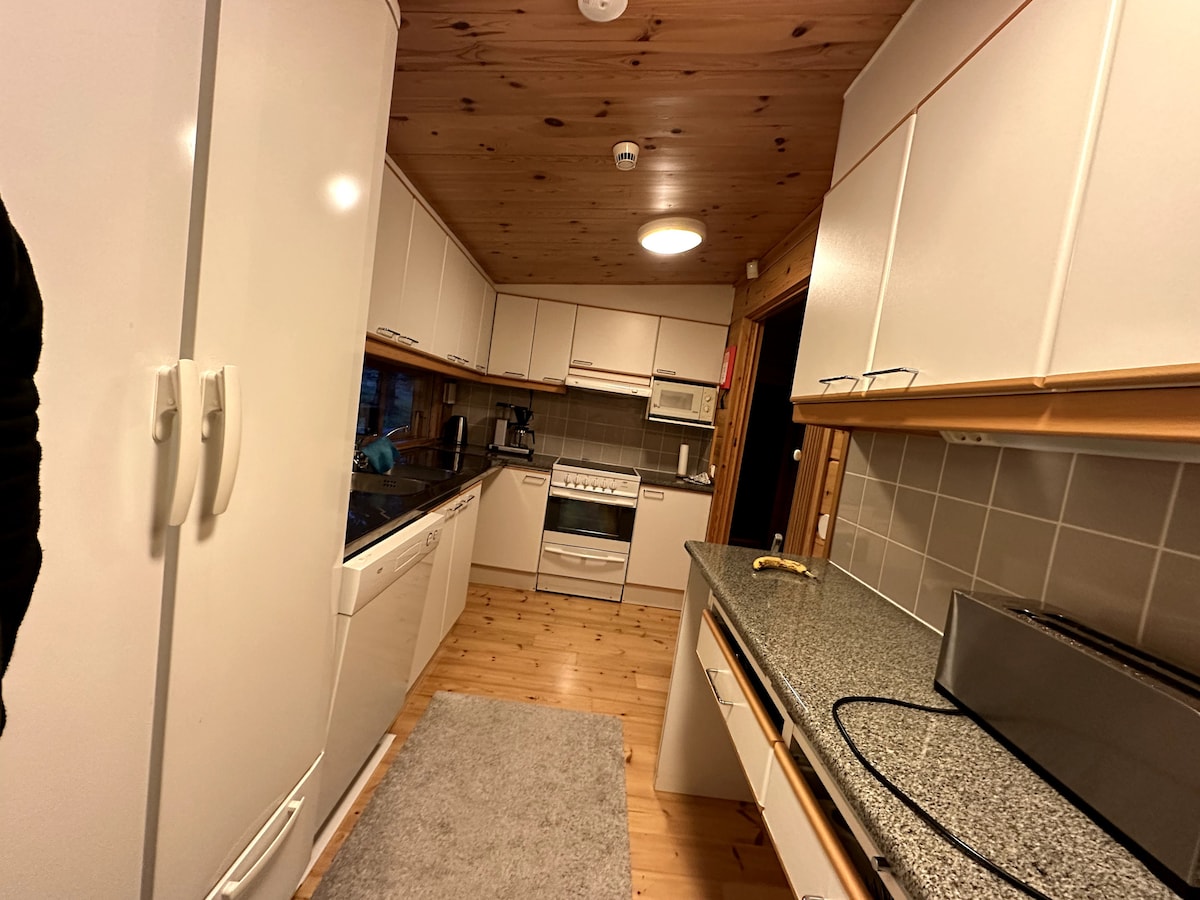 Rumah pribadi lengkap di area yang sangat tenang, tepi hutan, dekat pusat kota. Lokasi dengan polusi cahaya yang sangat sedikit. Tempat yang bagus untuk melihat cahaya utara. Dua lantai. Kamar tidur lantai atas dengan tempat tidur ganda. Kamar tidur lantai dasar dengan dua tempat tidur terpisah, ruang tamu, dapur, toilet, kamar mandi, sauna, dan ruang utilitas. Balkon, teras, dan perapian. Centre of Ivalo 1 km Bandara Ivalo 10 km Saariselkä 32 km Inari 37 km