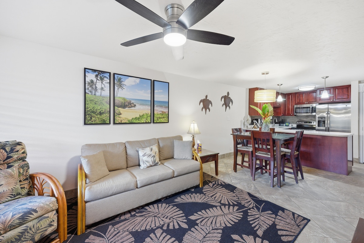 Beautifully remodeled 2 bedroom/2 bath condo w AC. Walk to amazing swim friendly Kalapaki beach. Fully equipped kitchen, furnished lanai, a king-size bed, 2nd bedroom has 2 twin beds which can be converted into 1 king upon request, and a queen sofa sleeper. Can accommodate up to 6 guests. Centrally located, easy access to north & south shores, Waimea Canyon,5 min from the airport. 5 minute walk to Kalapaki beach, delicious walkable restaurants & shopping. Heated pool, pickle ball, gas grills