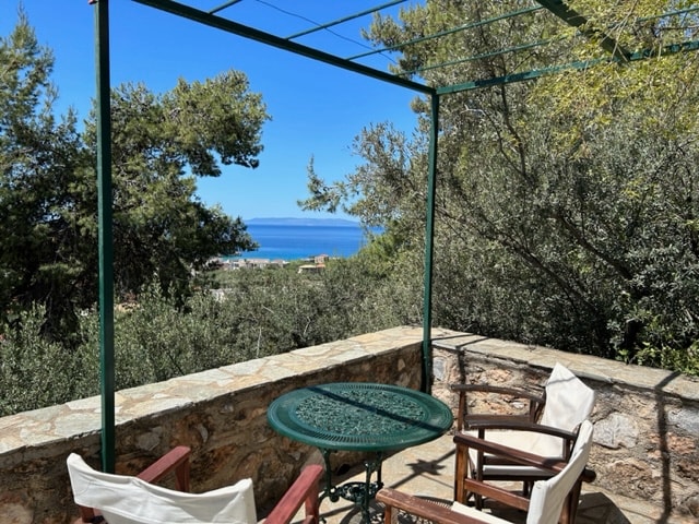 Ideally located, both close to Kardamyli but also private. A remarkable guesthouse on two levels with cathedral ceilings and an exposed wood vaulted roof. With it's own entrance. There is a sitting area with fireplace and a sofa that sleeps 1-2, a kitchenette, spacious bathroom with shower, eating area and an exit to a private terrace with outdoor shower and sitting area. Upstairs a king size bed with spectacular views of the sea and mountains. A unique place with a style all its own.